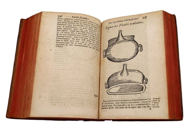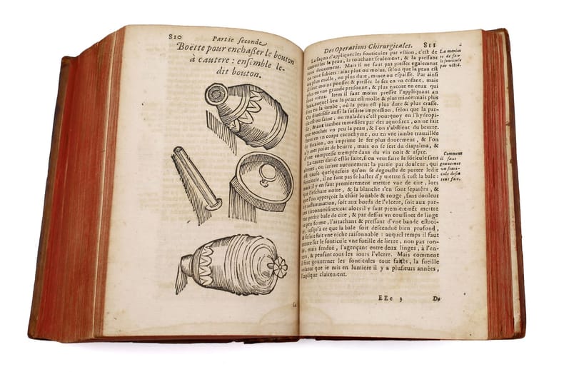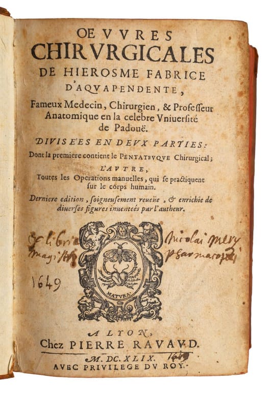 Lyon, Pierre Ravaud, 1649, in-12, [16]-936 (i.e. 930), [22] pp, Veau marbré du XVIIIe s, dos à nerfs et fleuronné, tranches rouges, Les Opera chirurgica ont paru pour la première fois en 1617. L'ouvrage, qui décrit les techniques les plus nouvelles de l'époque, a été réimprimé très souvent, jusqu'au XVIIIe siècle. Cette édition est illustrée d'une douzaine de figures sur bois dans le texte représentant divers instruments de chirurgie (trépans, scies, cautères, etc.) ainsi que des "phioles" oculaires. Girolamo Fabrizi (Fabrici) d'Acquapendente (1537-1619) est considéré comme le plus illustre anatomiste et le plus savant chirurgien de la fin du XVIe siècle. Il régna plus d'un demi-siècle sur l'Université de Padoue, où il fut l'élève de Fallope et de Vesale, puis le maître de Spiegel, Casseri et de Harvey. Cet ami de Galilée fit construire, à ses propres frais, le théâtre anatomique de Padoue, qui est resté préservé jusqu'à nos jours. Il est également renommé pour ses connaissances en anatomie cardiaque et, dans le domaine de la chirurgie, pour sa cure des hernies inguinales et pour la trachéotomie; il fut en effet le premier à recourir à ce geste opératoire en cas de difficulté respiratoire chez le patient. C'est enfin lui qui a rapporté la présence de valvules sur le trajet des veines et qui en fit la démonstration, dès 1574. Il pensait, à tort, que ces valvules servaient à ralentir le cours du sang, mais cette découverte essentielle sera le point de départ d'une découverte encore plus importante, la circulation du sang par son élève Harvey. Ex-libris manuscrit ancien sur la page de titre. Coiffe supérieure arasée. Manque angulaire à un feuillet (Ee8), réparé, avec restitution manuscrite du texte touché. Fine galerie de ver marginale sur une dizaine de feuillets, avec faible atteinte. Krivatsy, n° 3814. USTC n° 6905731. Couverture rigide