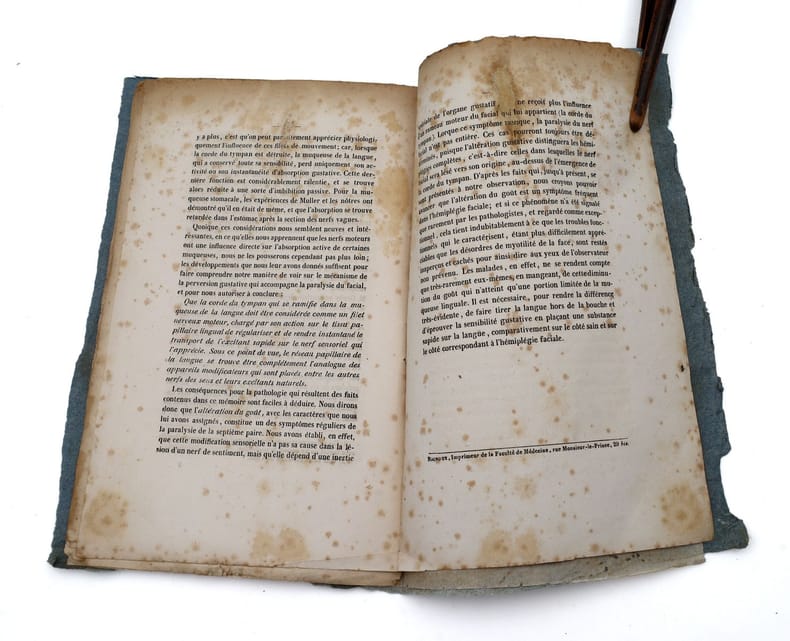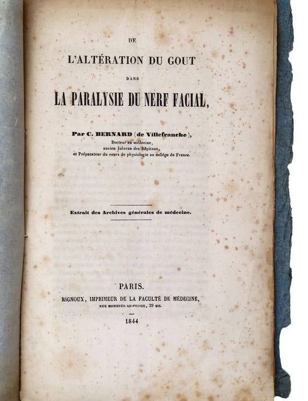 Paris, Rignoux, 1844, in-8, 19 pp, Broché, couverture muette de l'époque, Rarissime première édition, en tiré à part, de l'une des premières publications de Claude Bernard, qui signe sous le nom de "C. Bernard (de Villefranche)". Elle est extraite des Archives générales de médecine, où elle a été publiée à l'origine au sein de la série 4, n° 06 (Paris, Labé, Panckoucke, 1844, p. 480-496). Ce sujet a préoccupé l'auteur dès ses premiers pas en littérature scientifique. En 1843, il lui consacre sa première publication, intitulée "Recherches anatomiques et physiologiques sur la corde du tympan, pour servir à l'histoire de l'hémiplégie faciale" (parue dans les Annales médico-psychologiques, tome I, en mai 1843) ? quelques mois seulement avant de soutenir sa thèse sur le suc gastrique. Ici, le physiologiste s'intéresse plus spécifiquement aux cas d'hémiplégie faciale se présentant avec une altération du goût : il recueille quatre observations, puis expose les théories des fonctions du nerf facial. Cachet ex-libris du psychiatre Jules Falret (1824-1902), fils de l'aliéniste Jean-Pierre Falret. Exemplaire non coupé. Rousseurs, lacune sur le dernier feuillet, avec comblement de papier et de texte. Renan, L'Oeuvre de Claude Bernard. Paris, J.-B. Baillière, 1881, p. 340. Couverture rigide