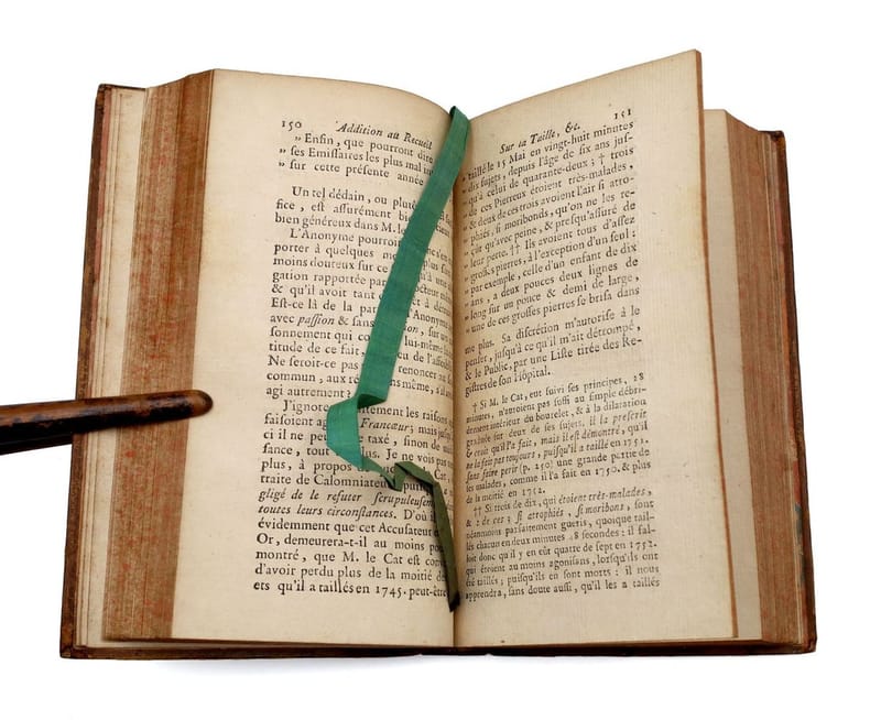 Paris et Rouen, d'Houry et Étienne-Vincent Machuel, 1753, in-12, [4]-XVIII-394-[1] pp, Veau marbré de l'époque, dos à nerfs et fleuronné, pièce de titre rouge, tranches rouges, Édition originale, peu courante. Cet ouvrage de Jean Baseilhac (1703-1781), frère Côme en religion, s'inscrit dans la polémique qui l'opposa au célèbre chirurgien Claude-Nicolas Le Cat (1700-1768), au sujet du lithotome à lame cachée. L'auteur répond précisément à un écrit de Le Cat, tout juste publié : Recueil de pièces concernant l'opération de la taille, qui contient la description de plusieurs lithotomes composés... (Rouen, Veuve Dumesnil, 1752). Le lithotome caché, inventé par Baseilhac en 1748, avait été jugé responsable d'un accident ayant coûté la vie à une jeune femme opérée par un confrère, le chirurgien Nicolas Museux : Jean Baptiste Caqué, chirurgien-chef de l'Hôtel-Dieu de Reims, apporta en conséquence une modification au lithotome, ce qui déclencha la colère du frère Côme. Dans cette dispute, Claqué bénéficia du soutien de son compatriote, Le Cat : ce dernier encourageait sa propre méthode, qui permettait d'opérer plus rapidement et de manière plus sûre. L'Académie royale de chirurgie, mise en demeure de trancher, finit par adopter le système de Le Cat. Baseilhac, chirurgien et lithotomiste attaché à Paris à l'Hôtel-Dieu, fonda à ses frais un hospice parisien pour les pauvres, où il soignait lui-même les patients. Il encouragea l'enseignement de la sage-femme Marguerite Angélique du Coudray. Ancien cachet paroissial. Mors supérieurs fendillés, légers frottements. Bon état intérieur, malgré des rousseurs éparses. Couverture rigide