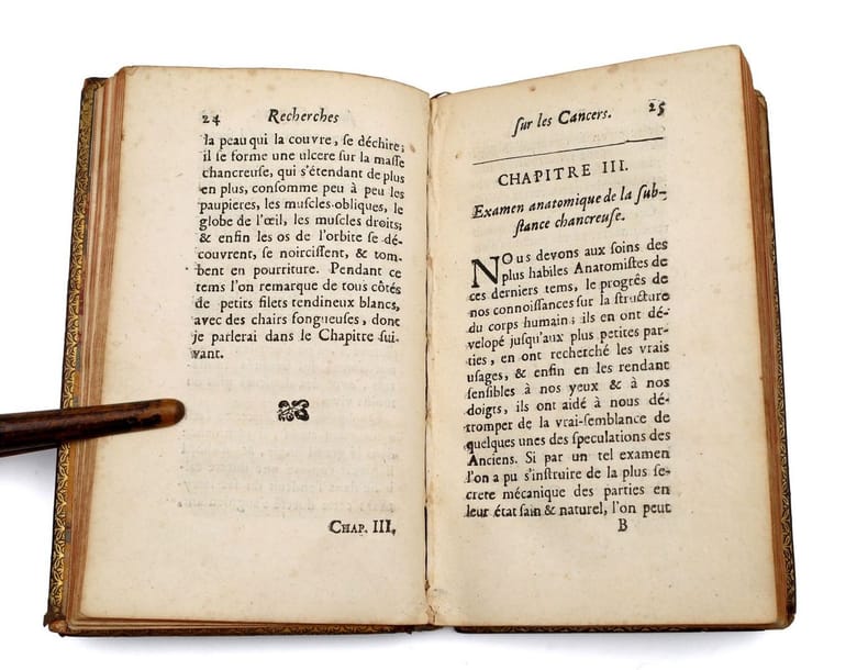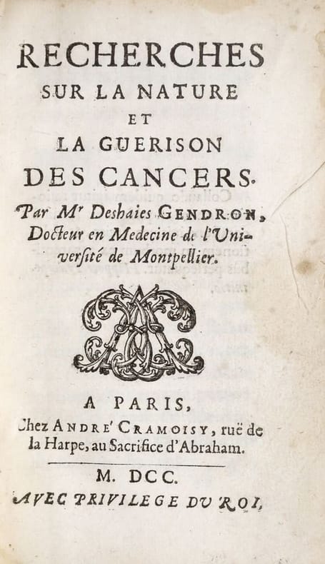 Paris, A. Cramoisy, 1700, in-12, [12]-155-[1] pp, Veau tabac de l'époque, dos à nerfs et ornée de petits fleurons, triple filet d'encadrement sur les plats, tranches rouges, Édition originale peu courante de cet ouvrage de Claude Deshaies-Gendron (1663-1750), médecin du régent Philippe II d'Orléans. L'auteur y donne les examens anatomiques de la "substance chancreuse", décrit l'accroissement des cancers et propose des remèdes : s'il préconise leur guérison par l'amputation et l'extirpation, il fait aussi la promotion de quelques escarotiques composés d'arsenic, d'orpiment ou de feuilles d'or, et d'autres substances palliatives telles que "l'or diaphorétique de Potérius, les remèdes de Mars, les préparations de cloportes et de vers de terre, & la teinture d'antimoine de Basile Valentin" (pp. 131-132). L'ouvrage fait également le récit de l'intervention de son grand-oncle François Gendron (1618-1688), auprès d'Anne d'Autriche en 1665 (p. 124 et suiv.) : ce chirurgien orléanais, curé de Voves et premier médecin connu à vivre en Ontario, sut soulager la reine mère qui était atteinte d'un cancer du sein, mais ne put la guérir. Coiffe supérieure arrasée, coins émoussés. Bon état intérieur, malgré des petites rousseurs éparses et de légères salissures. Krivatsy n° 3141. Couverture rigide