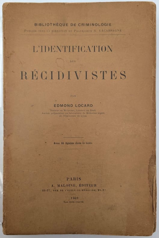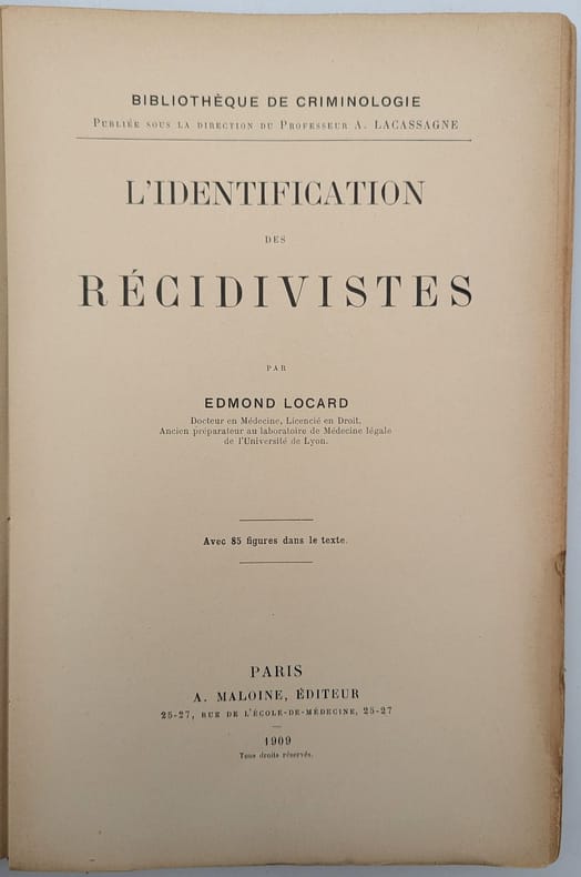 Paris, A. Maloine, 1909, in-8, [2]-IV-428 pp, Broché, couverture imprimée de l'éditeur, ÉDITION ORIGINALE de ce traité en criminologie d'Edmond Locard (1877-1966), le fondateur du premier laboratoire de police scientifique à Lyon en 1910 et, plus généralement, de la criminalistique. Il entretint une correspondance avec le célèbre auteur Conan Doyle qui s'inspira de ces travaux lors de la rédaction de ses ouvrages. Cet ouvrage est illustré de 85 figures dans le texte, il aborde toutes les facettes de l'identification judiciaire dont la photographie, la reconnaissance des marques particulières, le bertillonage ou la dactyloscopie. Un ouvrage très recherché. Dos gauchi, quelques pliures. Petits manques ou déchirures marginaux à la couverture, dos cassé, quelques rousseurs, un plat détaché. Ex-libris N.H. Couverture rigide
