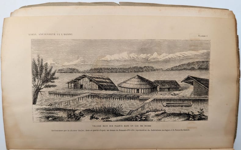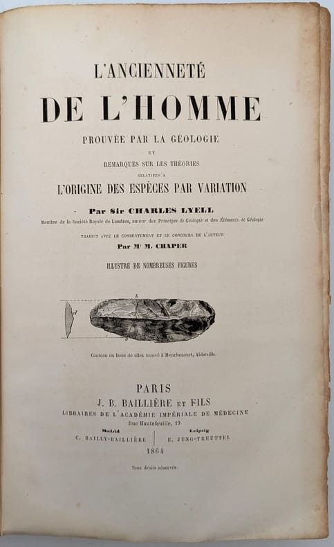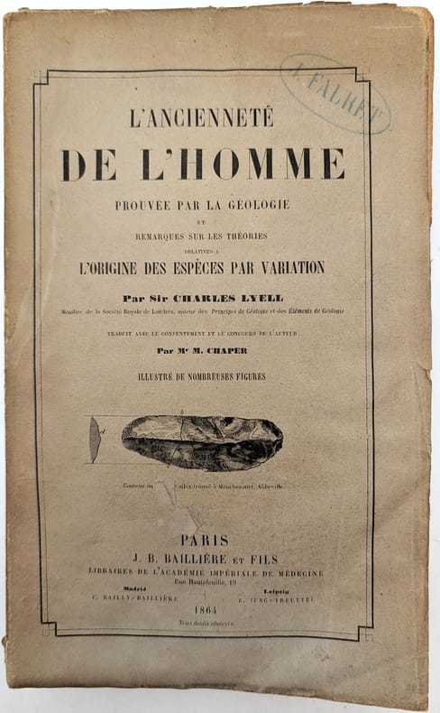 À Paris, J.-B. Baillière et fils, 1864, in-8, XVI-560 pp, Broché, couverture imprimée, Édition originale de la traduction française par M. Chaper de The Geological Evidences of the Antiquity of Man de Charles Lyell (1797-1875), publiée l'année précédente. Elle est illustrée d'un frontispice et plusieurs figures en noir dans le texte. Lyell fut l'un des plus importants géologues anglais du XIXe siècle. Il formula la théorie géologie de l'uniformitarisme, qui renonce une fois pour toutes à la notion d'intervention surnaturelle. Ses travaux ont grandement inspiré Charles Darwin, qui avait emporté le premier volume des Principes de géologie sur le Beagle. Tampons ex-libris J. Falret. Couverture un peu défraîchie, quelques rares rousseurs, mouillure marginale. Couverture rigide