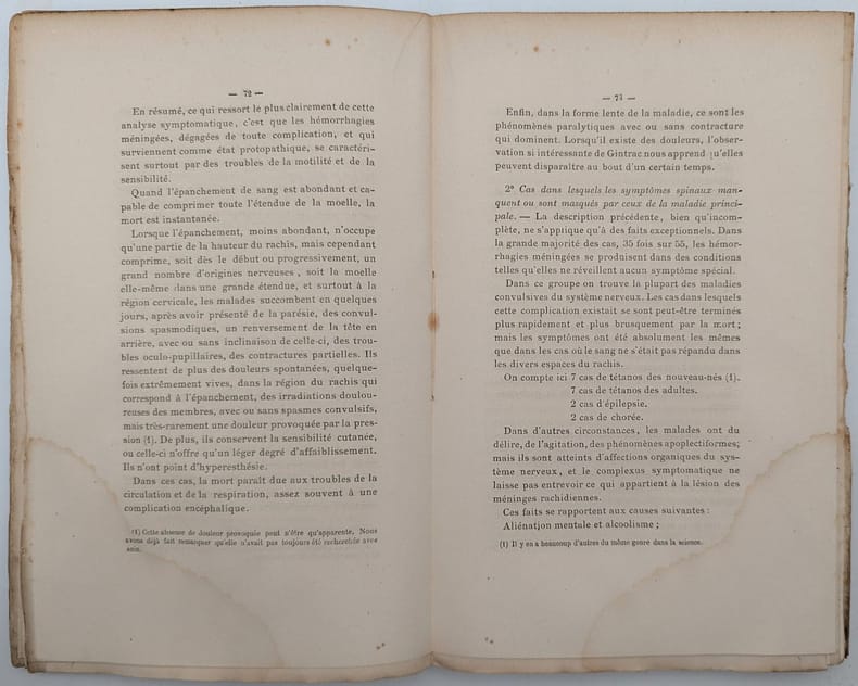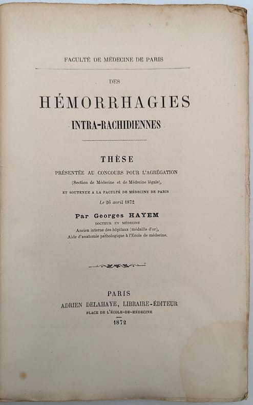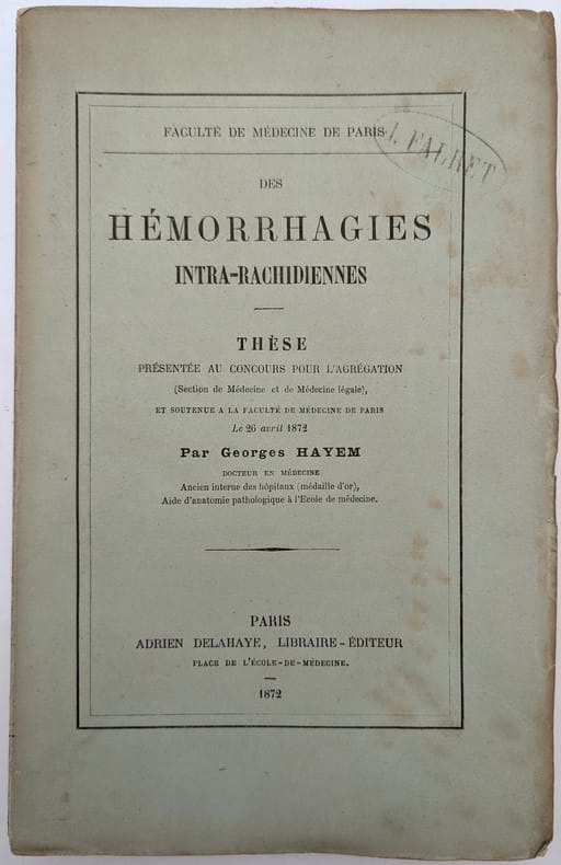 Paris, V. Adrien Delahaye, 1872, in-8, [4]-232 pp, broché, couverture imprimée de l'éditeur, Édition originale de ce thèse présentée au concours pour l'agrégation soutenue le 26 avril 1872 Le physiopathologiste-hématologue Georges Hayem (1841-1933), fut médecin des hôpitaux de Paris, professeur à la Faculté de médecine de Paris et membre de l'Académie de médecine. Il enseigna les maladies du sang à l'hôpital Saint-Antoine. Exemplaire non coupé. Tampon ex-libris Jules Falret. Deux petits manques au dos, pâles rousseurs à la couverture. Couverture rigide