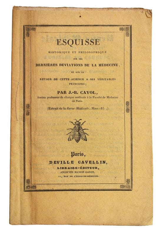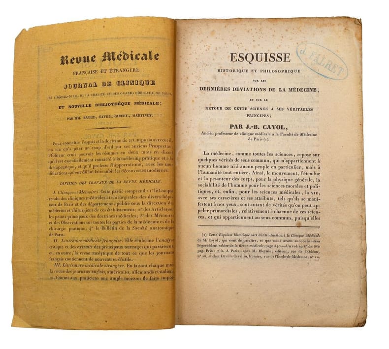Paris, Deville Cavellin, Mars 183[3], in-8, 28 pp, Broché, couverture jaune de l'éditeur, Joli exemplaire, tel que paru, de cet opuscule, tiré à part de la Revue médicale. Il s'agit d'une introduction à la Clinique médicale, publiée en 1833 (Paris, Bleynie). Bruno Cayol (1787-1856), ancien professeur de clinique médicale à la Faculté de Paris, est le traducteur du Traité des hernies de Scarpa (Paris, Gabon, 1812). Tampon ex-libris du psychiatre J[ules] Falret. Rousseurs. Wellcome II, p. 317. Couverture rigide