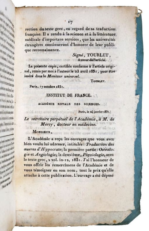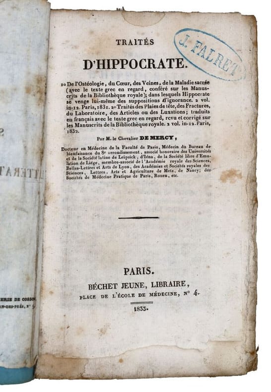 Paris, Béchet jeune, 1833, in-12, [4]-24 pp, Broché, couverture muette, Rapport de René Tourlet (1757-1836) sur les traductions des oeuvres d'Hippocrate par François Christophe Florimond de Mercy (1775-1849), médecin parisien spécialisé dans la médecine grecque. La portée des travaux du Chevalier de Mercy ont conduit à la création à la faculté de médecine de Paris d'une chaire spéciale pour l'enseignement des écrits d'Hippocrate. Tampons ex-libris du psychiatre J[ules] Falret. Rousseurs éparses. Couverture rigide