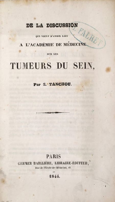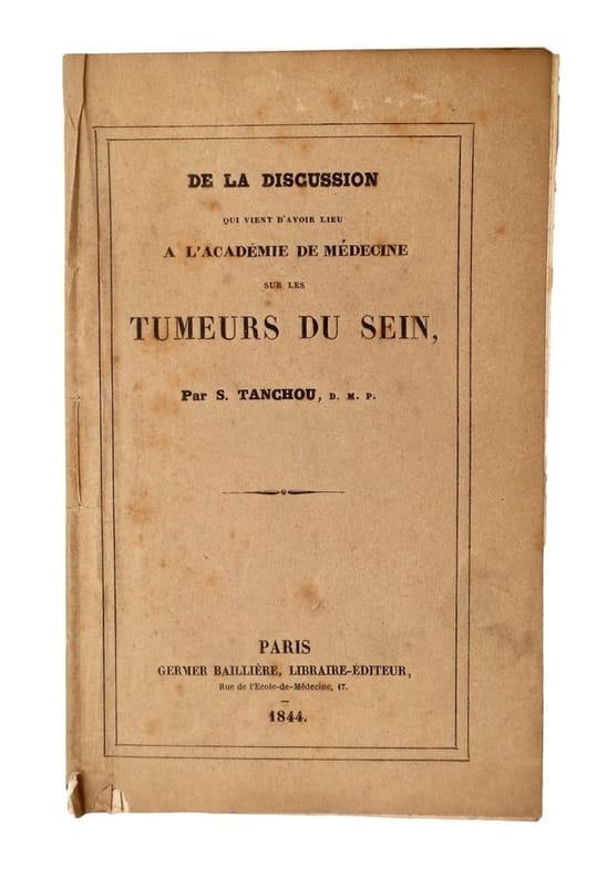 Paris, Germer Baillière, 1844, in-8, 31 pp, Broché, couverture imprimée de l'éditeur, Édition originale de cet opuscule : l'auteur y rapporte son opinion sur une discussion qui a eu lieu à l'Académie de médecine ? sans qu'il n'ait eu le temps d'y prendre part ? sur le diagnostic, la nature, la cause et la cure du cancer du sein. Stanislas Tanchou (1791-1855), mena une courte carrière militaire dans les armées napoléoniennes avant de devenir docteur en médecine de la Faculté de Paris en 1819, avec une thèse d'obstétrique. Cachet ex-libris du docteur J[ules] Falret. Rousseurs éparses. Wellcome V, 232. Couverture rigide