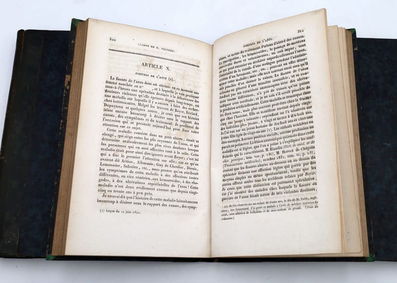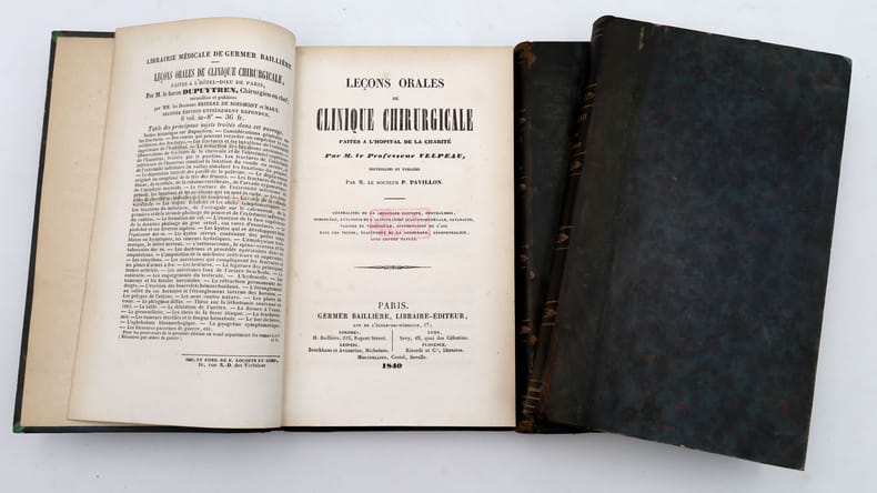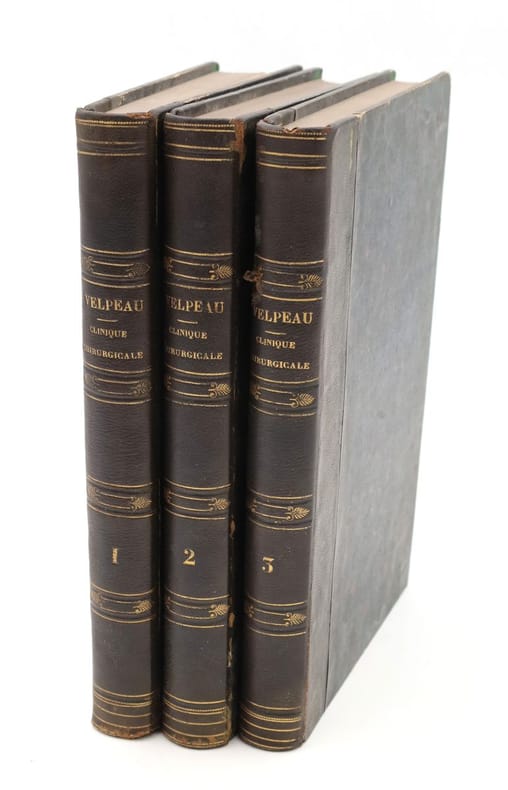 Paris, Germer Baillière, 1840-1841, in-8, 3 vol, VIII-563 pp. + VIII-559-[1] pp. + [4]-505 pp, Demi-chagrin vert foncé, dos lisses et filetés, Première édition de ces leçons recueillies et publiées par les docteurs Pavillon et Jeanselme. Velpeau (1795-1867) était titulaire de la chaire de clinique chirurgicale à la Faculté de médecine de Paris. Ces leçons, professées à La Charité, développent des idées tout à fait neuves que Velpeau applique au diagnostic et au traitement des maladies dites chirurgicales. L'auteur définit la clinique comme "de la pathologie au lit des malades", ou "une métamorphose continuelle des principes théoriques en application pratique". Étiquette ex-dono de Jacques Liouville. Tampons de l'Institut catholique de Paris. Dos passés avec petits accrocs, charnières fragiles. Rousseurs. Couverture rigide