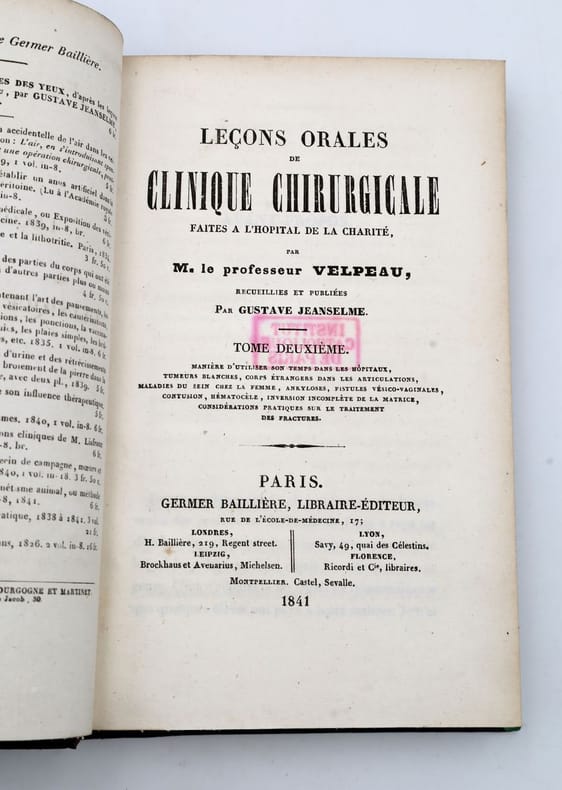 Velpeau "fut l'un des premiers, en France, à utiliser l'anesthésie (.) et a préconisé l'emploi d'une certaine bande en tissu spécial élastique, qu'on nomme communément bande Velpeau" (Larousse, Dictionnaire des médecins célèbres). Renferme au Tome Premier : "Généralités de la chirurgie clinique, ophtalmies, Hydrocèle, luxations de l'articulation scapulo-humérale, cataracte, varices et varicocèle, introduction de l'air dans les veines, traitement de la gonorrhée, xérophtalmie, anus contrenature" ; au Tome second : "Manière d'utiliser son temps dans les Hôpitaux, Tumeurs blanches, corps étrangers dans les articulations, maladies du sein chez la femme, ankyloses, fistules vésiculo-vaginales, contusion, Hématocèle, inversion incomplète de la matrice, considérations pratiques sur le traitement des fractures" ; Remise de 20% pour toutes commandes supérieures à 200 €