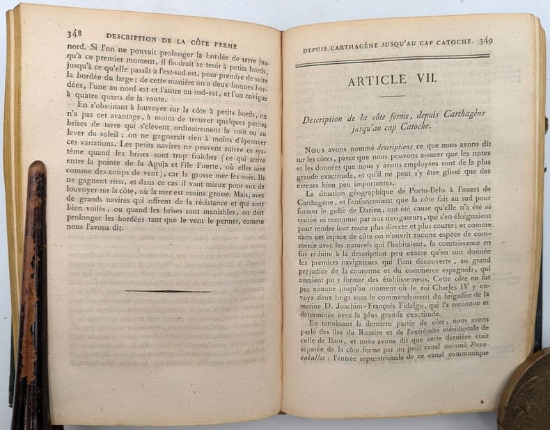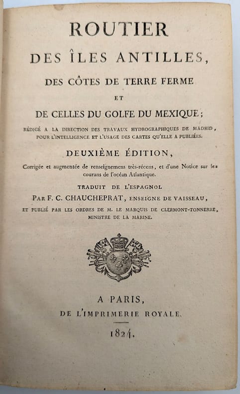 Paris, Imprimerie Royale, 1824, in-8, VII-602 pp, Demi-basane brune, dos lisse à fleurons et titre dorés, Deuxième Edition, corrigée et augmentée de cette description des Antilles fournissant des informations liées à la anvigation. Reliure un peu défraîchie mais solide, quelques petites rousseurs. Ex-libris Gourbeyre. Couverture rigide