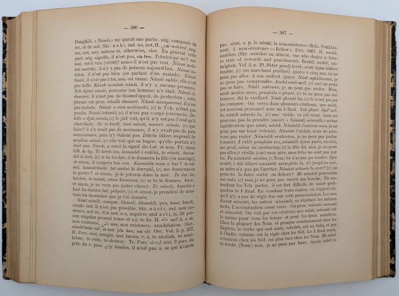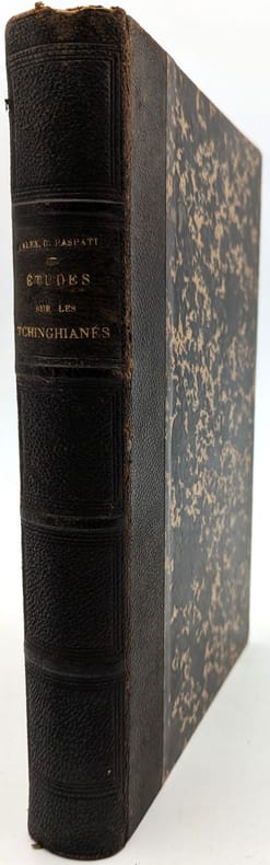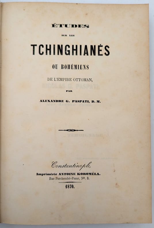 Constantinople, ?Imprimerie Antoine Koroméla, 1870, in-8, X-[2]-652 pp, Demi-chagrin noir, dos à faux nerfs orné de filets à froid, Édition originale rare de cet ouvrage consacré aux tziganes de l'empire ottoman. L'auteur y aborde l'histoire de ce peuple et de sa langue. Il comprend également, in fine, un lexique puis la retranscription et la traduction de contes traditionnels. Alexander George Paspatis était un médecin grec et byzantologue réputé de son époque. Cet ouvrage est l'un des rares sur la question et conserve tout son intérêt de nos jours. Petits frottements et épidermures, quelques pâles rousseurs et taches en début et fin de volume, quelques annotations de lecture. Peu commun sur le marché. Couverture rigide