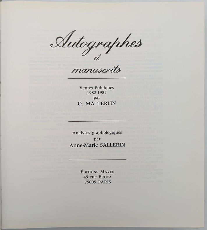 1985, Mayer, in-4 cartonné de 830 pages, Autographes et Manuscrits, ventes publiques 1982-1985 par O. Matterlin, analyses graphologiques par Anne-Marie Sallerin | Etat : bon état, petits accrocs sur la jaquette (Ref.: G8443)