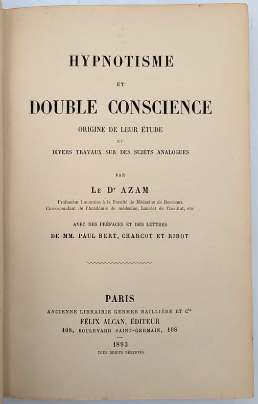 Paris, J.-B. Baillière, 1893, in-8, 375 pp, demi-basane verte, dos à faux nerfs, tranches mouchetées, Seconde édition, parue 6 ans après la première (Paris, J.-B. Baillière, 1887). Charles Etienne Azam (1822-1899), chirurgien, fut le premier en France à reproduire l'expérience hypnotique de James Braid. Il traite ici du cas surprenant de Félida X. qu'il soigne depuis 1858 : il s'agit de l'un des cas les plus célèbres de dédoublement de personnalité. Azam décrit chez sa patiente un "état normal", souple, qui supporte la "légitime autorité" de son mari, doublé d'une ou plusieurs "conditions secondes", plus excentriques et enjouées, correspondant à des accès de somnambulisme ; tandis que Félida, dans son état premier, ne conserve par la mémoire de ces accès, elle a, à l'inverse, pleinement conscience de son dédoublement dans ses états seconds. Caillet I, n° 585. Crabtree, n° 1159. Tampon ex-libris du docteur Besson. Dos insolé, frottements, infimes rousseurs éparses. Couverture rigide