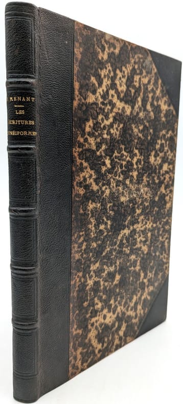 Paris, Librairie orientale de Benjamin Duprat, Mars 1860, in-8, 214 pp, Demi-chagrin noir à coins, dos à nerfs orné de filets à froid, Édition originale comprenant des tableaux d'écritures cunéiformes étudiés et classés par Joachim Ménant (1820-1899), philologue assyriologue français et magistrat de son premier métier. Cette publication est certainement la première publication de l'auteur sur le sujet et constitue une source de documentation très précieuse pour l'époque qui retrace les diverses formes d'alphabets connus entre le XVIIIe siècles et 1858. Rare. Pâles rousseurs. Couverture rigide