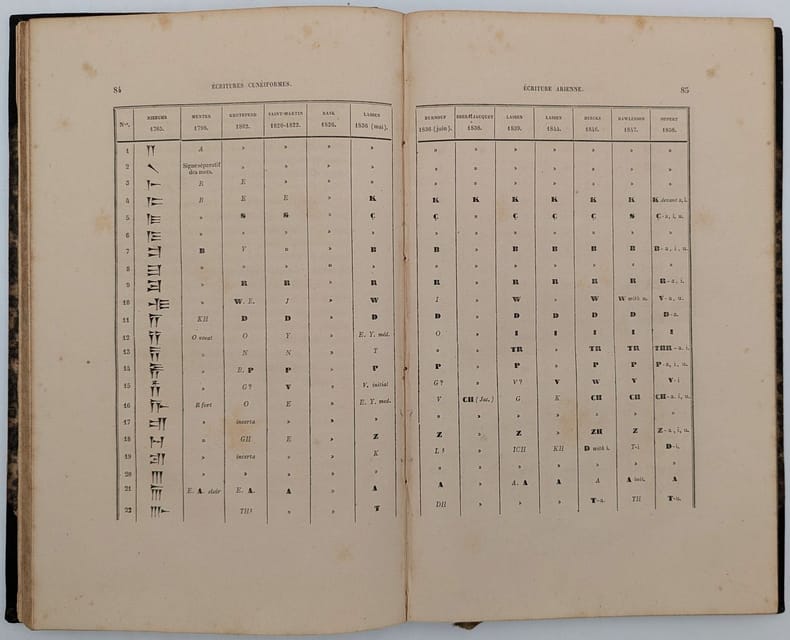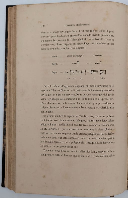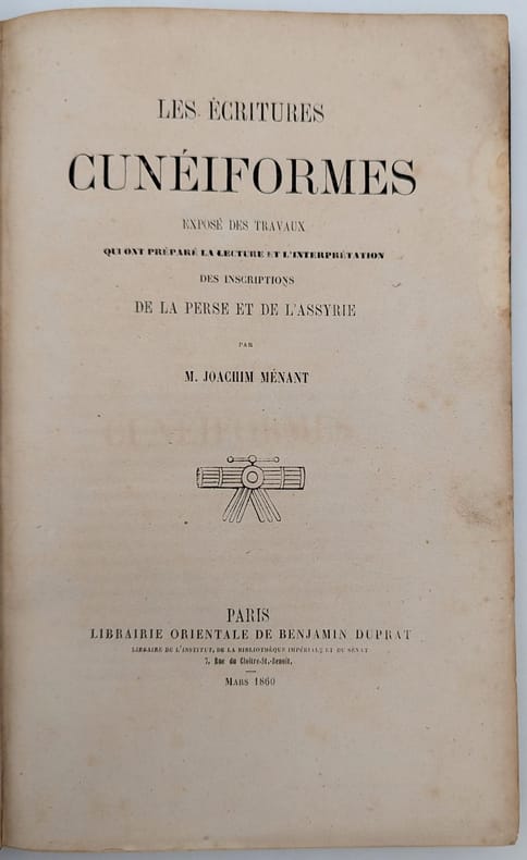 Paris, Benjamin Duprat, 1860, 28 x 18 cm, 214 pp, half leather binding, orig. printed wrapper preserved. First pages slightly foxed. (Fine copy of the first edition). (Persia, Assyria, philology, cuneiforms).