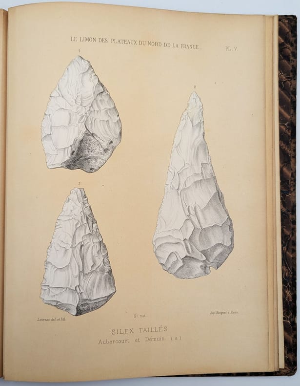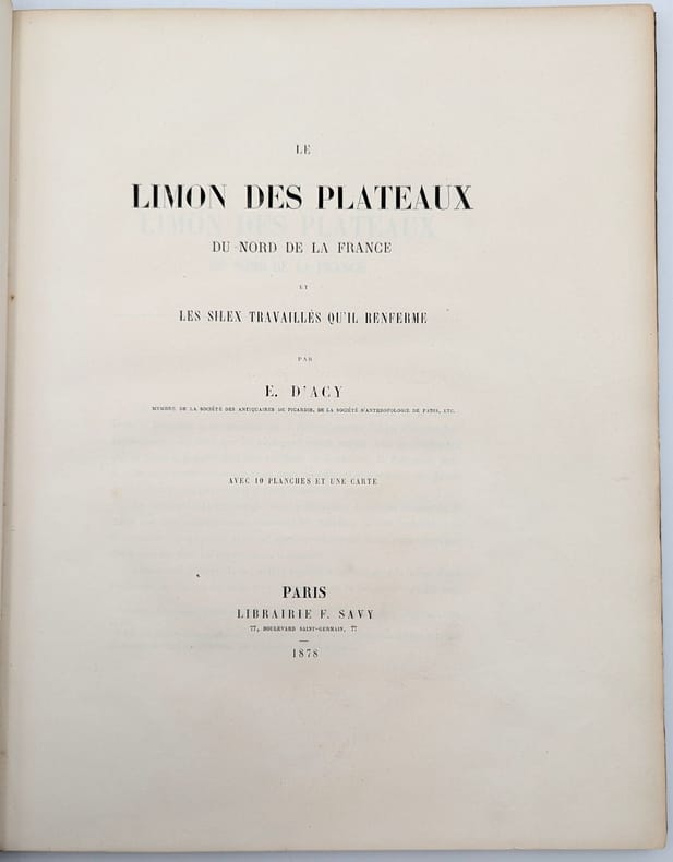 Paris, Librairie F. Savy, 1878, in-folio, 72 pp. 10 pl. 1 carte, Demi chagrin noir de l'époque, titre doré, Édition originale illustrée d'une carte des gisements étudiés, d'un tirage photographique contrecollé représentant la coupe d'une sablière de Saint-Acheul et de 9 belles planches lithographiques sur fond jaune représentant les silex taillés découverts. Ernest d'Arcy était un préhistorien de premier plan, qui vendit notamment de sa collection au Musée des Antiquités nationales, actuel Musée d'Archéologie nationale. Bon exemplaire, coins frottés, quelques annotations au crayon en marge de la photographie. Couverture rigide