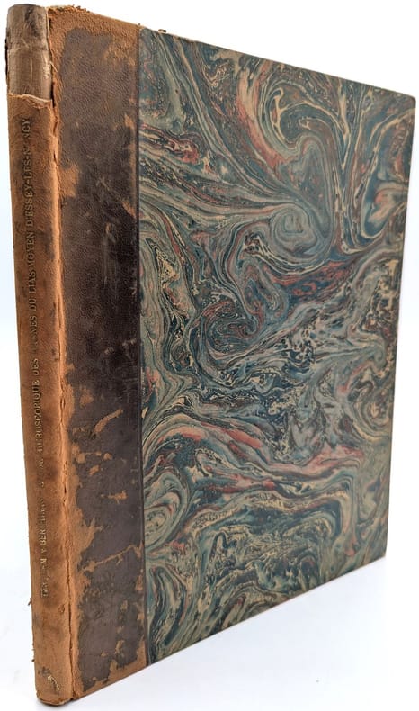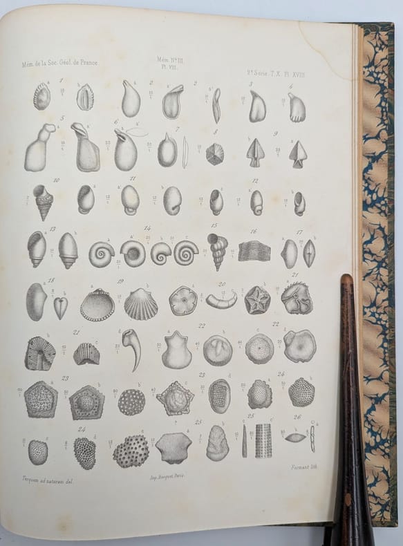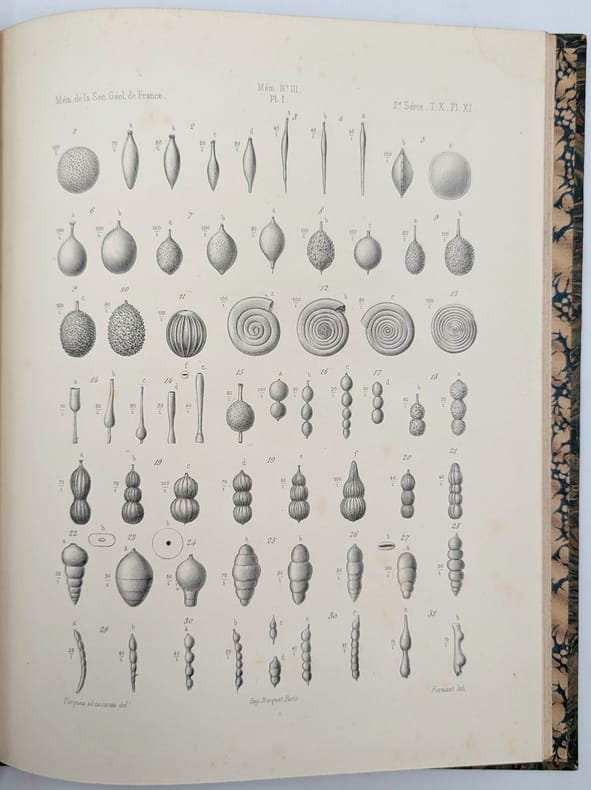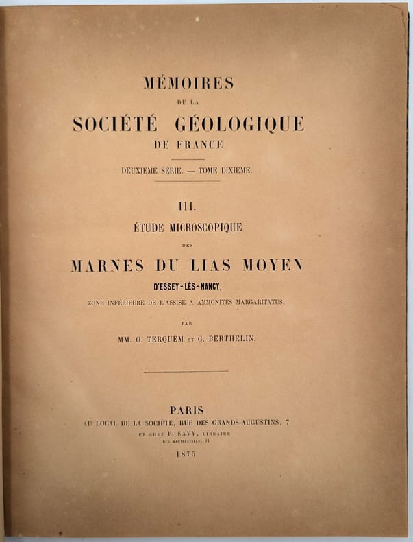 Paris, F. Savy, 1875, in-folio, 126 pp. 10 pl, Demi-basane brune, dos long, tranches mouchetées, Édition originale de cet essai géologique, Xe tome de la deuxième série des Mémoires de la Société géologique de France. Il est illustré de 10 planches gravées par Formant d'après les dessins de Terquem. Épidermures et frottements, manque en tête du dos, 1 mors fendu, page de titre roussie, quelques pâles rousseurs. Couverture rigide