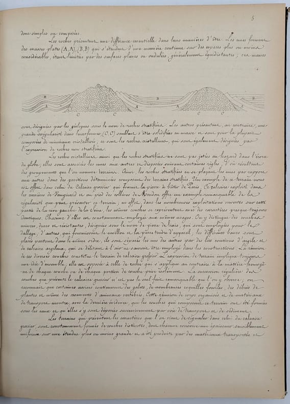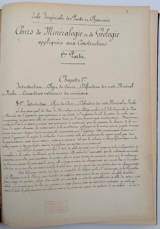 Ecole impériale des Ponts et Chaussées, 1862, in-folio, 160 pp, Demi-basane verte, dos long orné de filets dorés et à froid, tranches mouchetées, Nouvelle édition de la première partie de ce cours professé à l'École impériale des Ponts et Chaussées. Il est illustré de figures en noir dans le texte. Reliure défraîchie mais solide, quelques infimes rousseurs Étiquettes et tampons de l'Institut catholique de Paris. Couverture rigide