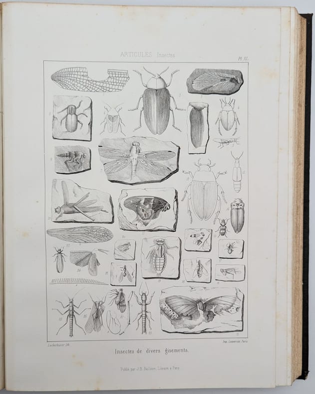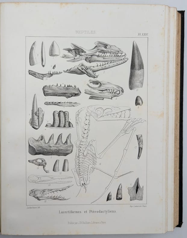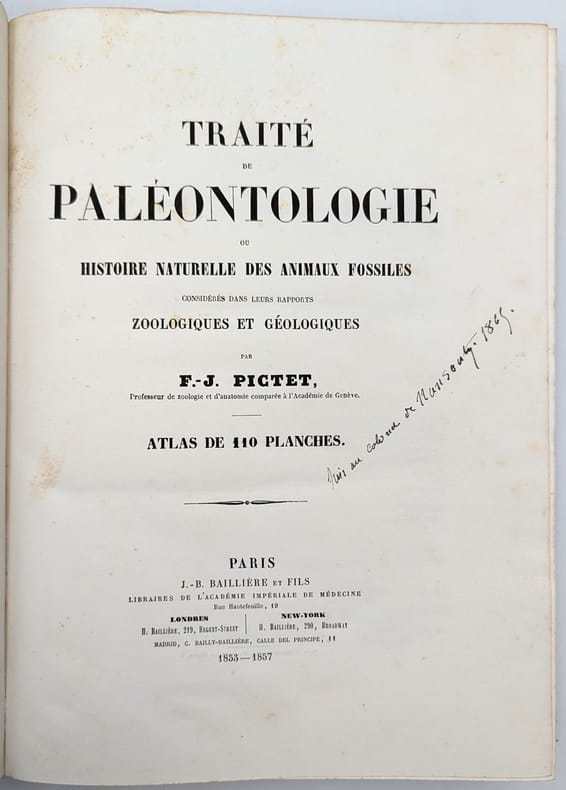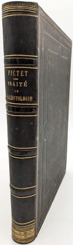 Paris, J.-B. Baillière, 1853, in-folio, 77 pp. 110 pl, Demi-chagrin noir, plats de percaline chagrinée noire estampée à froid, dos long orné de filets dorés, tranches mouchetées, Seconde édition de l'atlas seul, après une première édition parue 1844-46, augmentée de plus de 30 planches d'un des grand textes du XIXe siècle de paléozoologie et d'anatomie comparée, par un des tenants, avec Cuvier, du créationnisme (fixisme selon la terminologie de Cuvier). Il est composé de 110 planches représentant des ossements de nombreux mammifères terriens et aquatiques, reptiles, dinosaures, oiseaux, poissons, insectes, animaux marins et fossiles. Toutefois, malgré sa posture conservatrice face aux nouvelles idées du transformisme et de l'évolutionnisme, dans le présent Traité de Paléontologie, il reconnait l'hypothèse d'un mécanisme d'évolution entre les espèces. Mais Pictet ne peut suivre la théorie darwiniste jusqu'au bout et il lui objecte que l'immense diversité des formes de vie, propre aux ères primitives des recensement paléontologique conteste l'idée darwinienne des types primitifs. Petits frottements et épidermures, quelques pâles rousseurs éparses. Ex-libris du colonel de Nansouty, daté de 1865. Couverture rigide