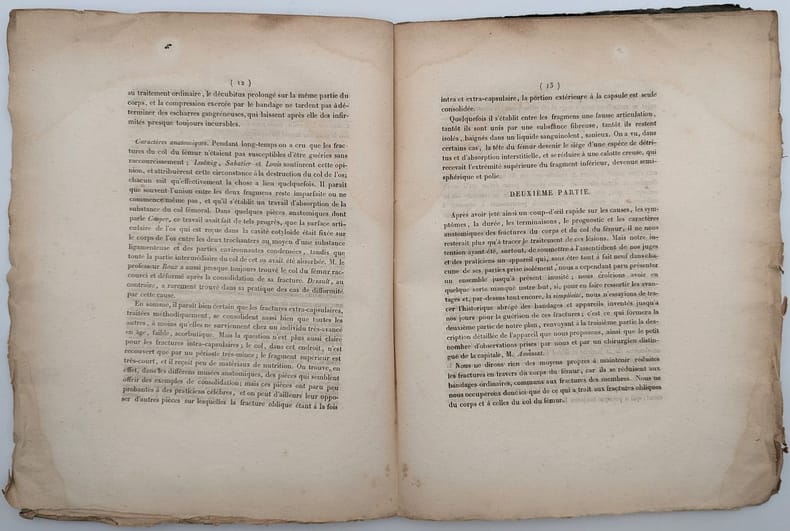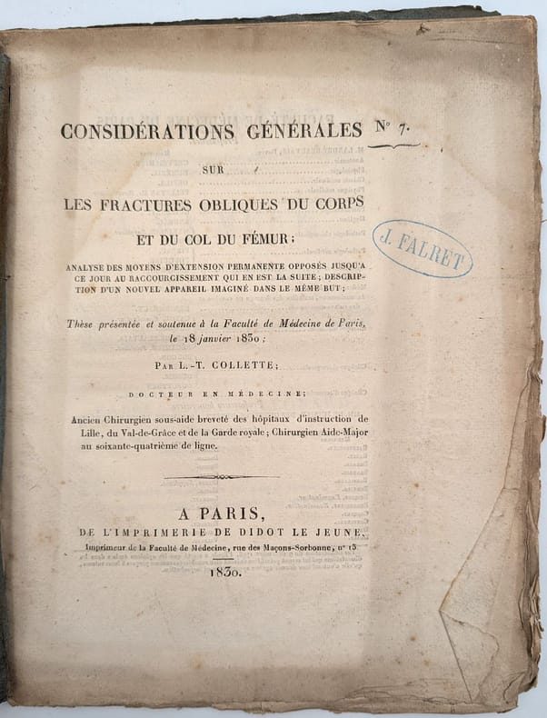 Paris, de l'Imprimerie de Didot Le Jeune, 1830, in-4, 30 pp, Broché, couverture bleue muette, Édition originale de cette thèse soutenue à la Faculté de médecine le 18 janvier 1830. Couverture et marges empoussiérée, infimes déchirures marginales, une plus importante au premier plat, importantes mais pâles mouillures, quelques petites rousseurs. Exemplaire non coupé. Tampon ex-libris de J. Falret (1824-1902), médecin aliéniste, fils de Jean-Pierre Falret. Couverture rigide