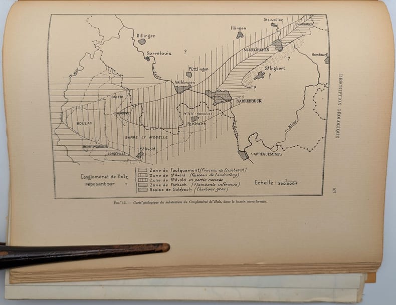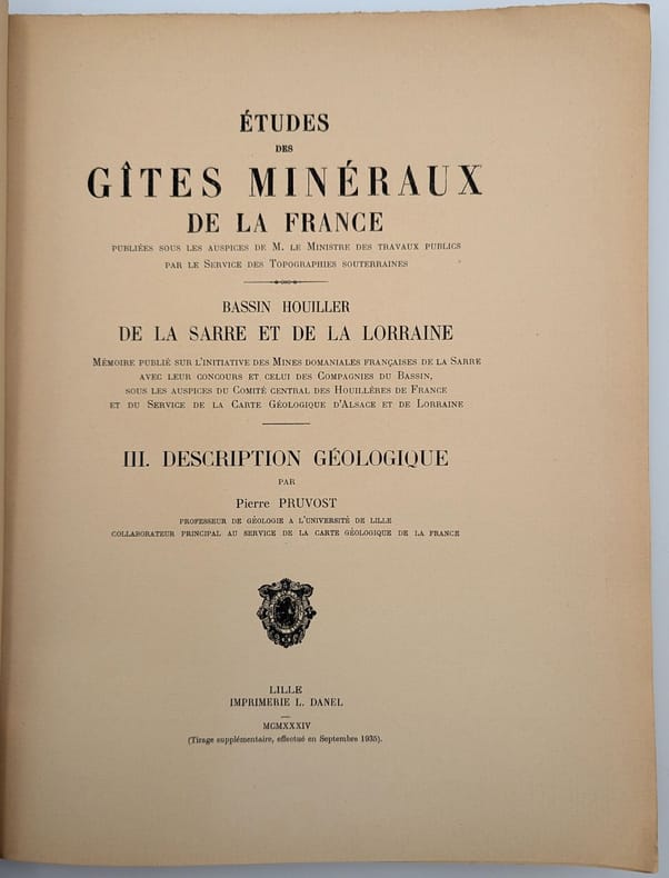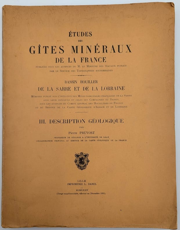 Lille, Imprimerie L. Danel, 1934, in-4, 175 pp. 3 pl. dépliantes, Broché, couverture imprimée, Édition originale de cette monographie consacré au bassin de charbon de la Sarre et de la Lorraine. Elle est illustrée de trois grandes cartes en couleurs dépliantes et quelques figures dans le texte. Cet exemplaire comporte un envoi autographe signé de l'auteur à Eugène Gérard. Petites déchirures et taches. Couverture rigide