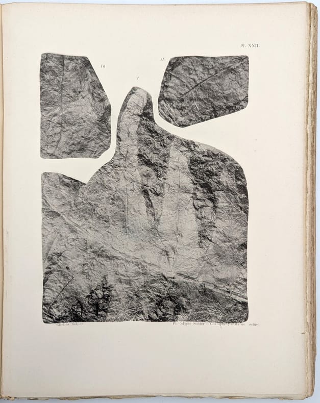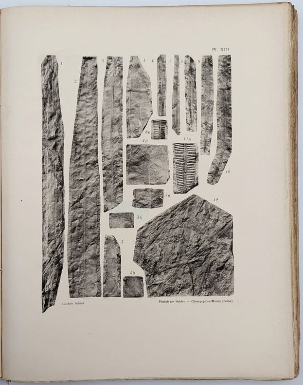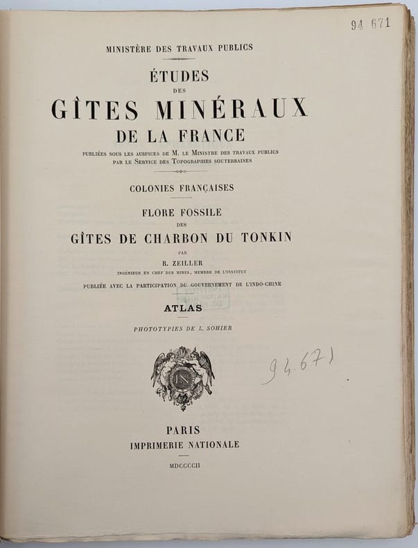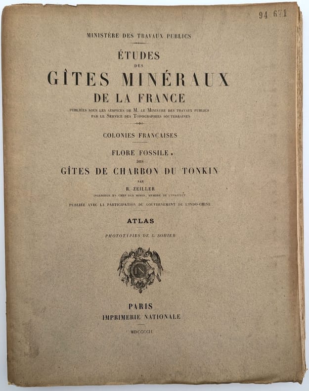 Paris, Imprimerie Nationale, 1902, in-4, LVI pl, Broché, couverture imprimée, Édition originale de l'atlas de cette monographie consacrée aux fossiles de plantes du Tonkin. Il est composé de 56 planches en noir avec leur feuillet descriptif. Couverture un peu défraîchie, dos gauchi, marges un peu empoussiérée. Étiquette et tampons de l'Institut catholique de Paris. Couverture rigide