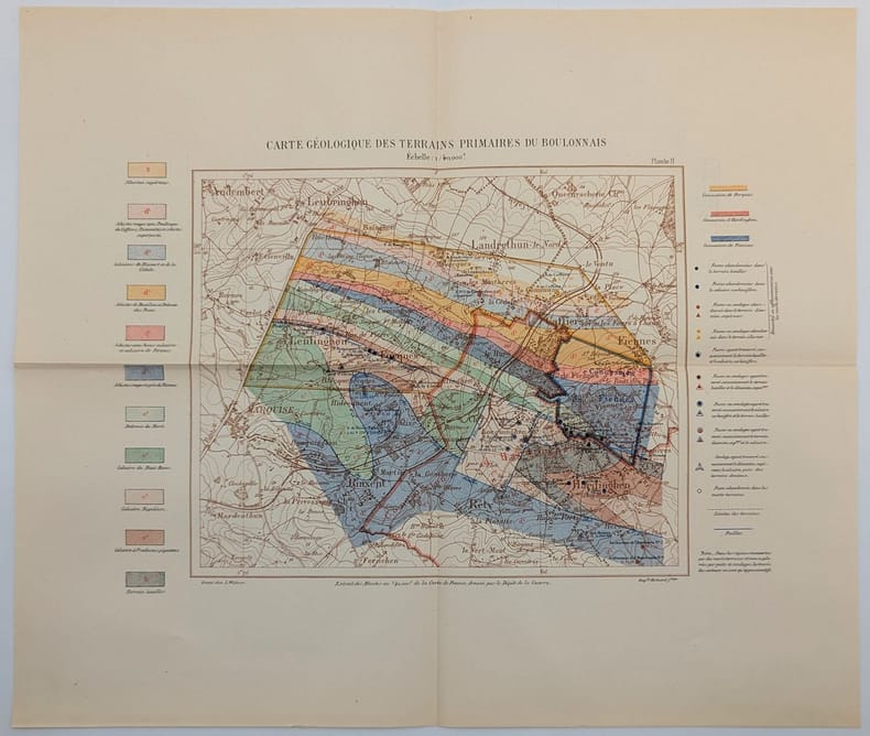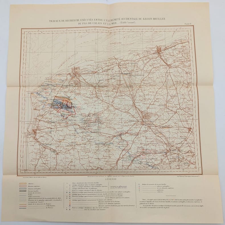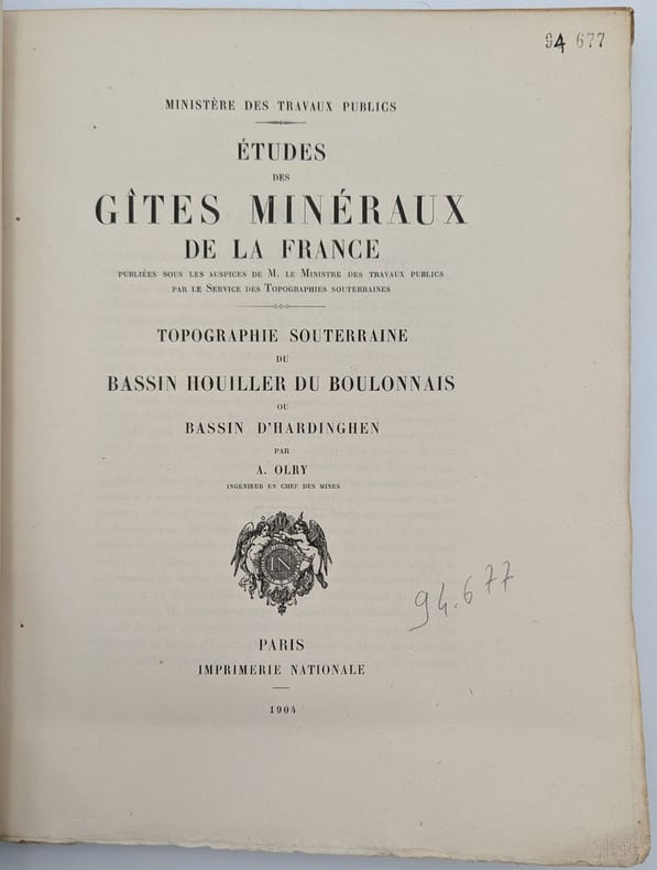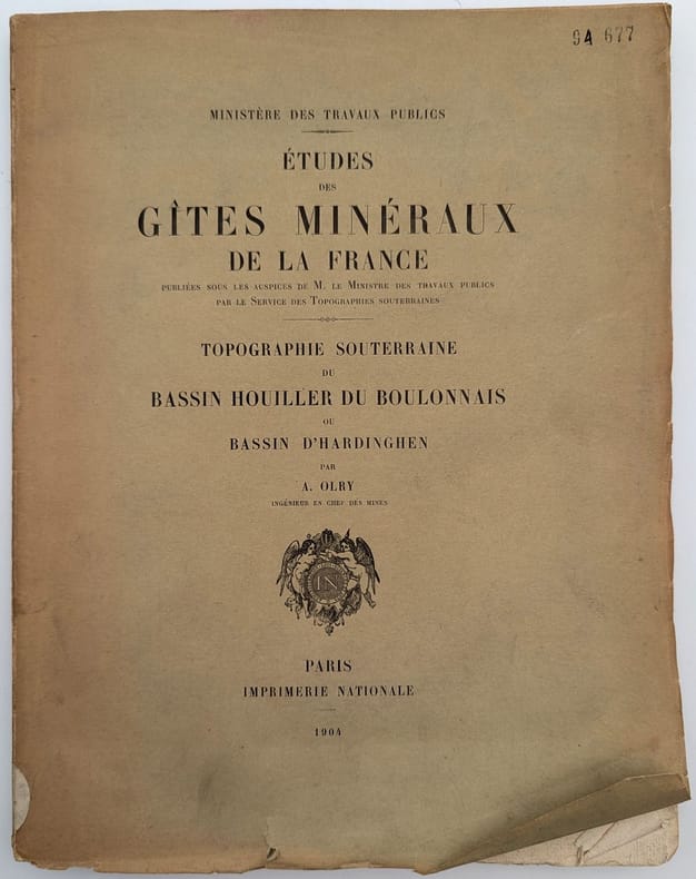 Paris, Imprimerie Nationale, 1904, in-4, 240 pp. 3 cartes dépliantes non reliées, Broché, couverture imprimée, Édition originale de cette monographie consacrée au bassin minier picard. Elle est illustrée de plusieurs figures dans le texte ainsi que de 3 grandes cartes en couleurs. Elle a été publiée sous les auspices du Ministère des Travaux publics dans la collection des Études des gîtes minéraux de France par le Service des topographies souterraines. Couverture défraîchie, quelques taches. Exemplaire non coupé. Étiquette et tampons de l'Institut catholique de Paris. Couverture rigide