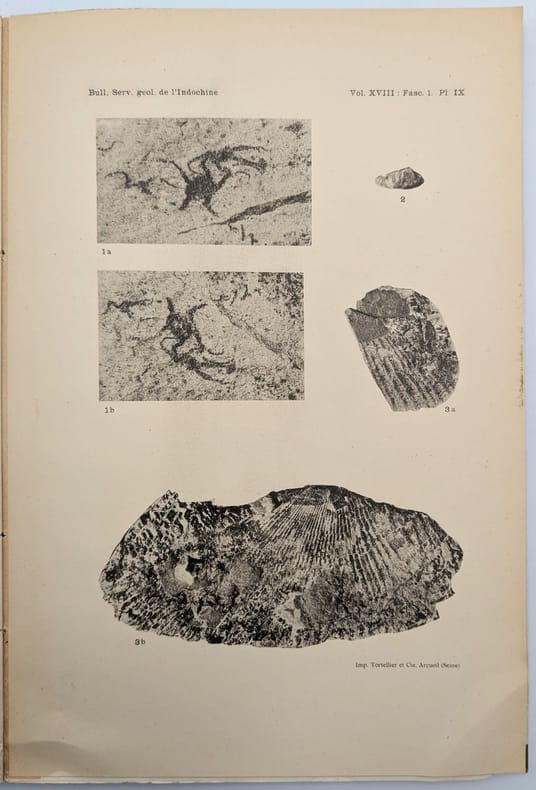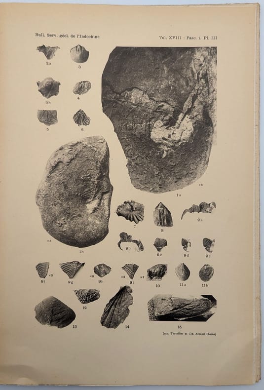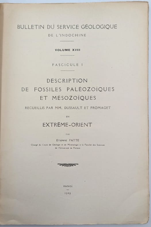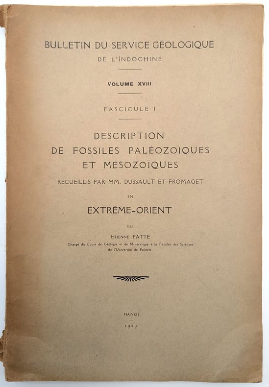 Hanoï, s.n, 1929, in-4, 112 pp. IX pl, Broché, couverture imprimée, Édition originale peu commune du premier fascicule du XVIIIe volume du Bulletin du service géologique de l'Indochine. Elle est illustrée de 9 planches hors-texte. Étienne Patte (1891-1987) était un paléontologue français qui passa une partie de sa vie dans l'Est du Tonkin à faire des recherches pour le compte du service géologique de la région. Dans le présent ouvrage, il décrit les fossiles découvert par Dussault en Indochine et Fromaget dans le Yunnan. Couverture un peu défraîchie. Exemplaire non coupé. Couverture rigide