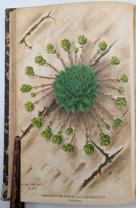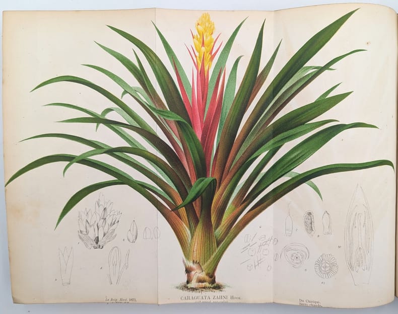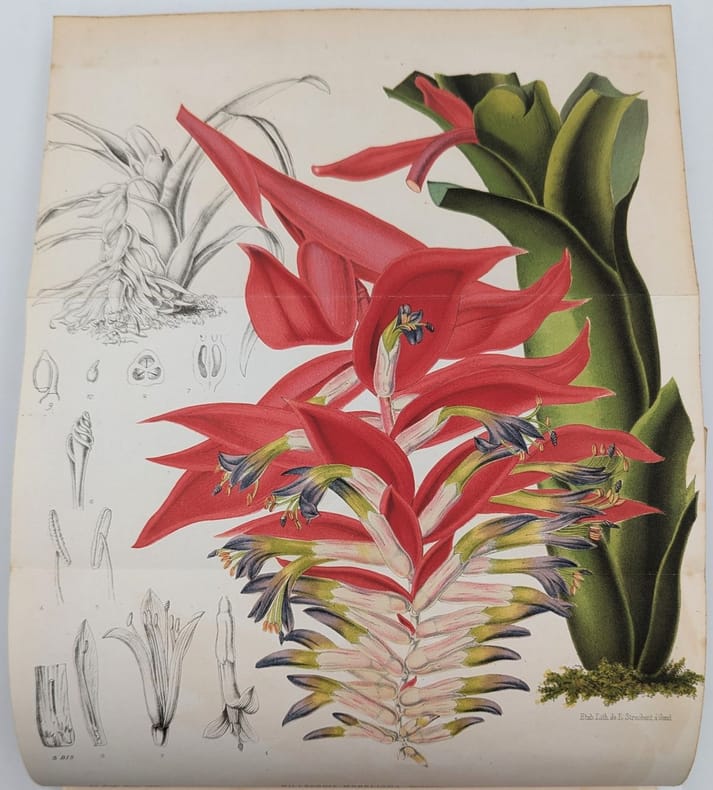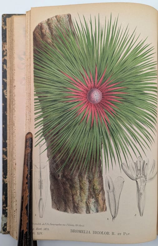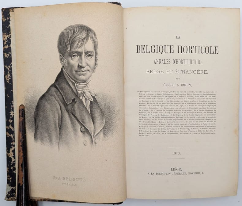 Liège, À la direction générale Boverie, 1, 1873, in-8, 384 pp. fig. dans le texte, 24 pl. dont 14 en chromolithographie, Basane aubergine de l'époque, dos lisse et fileté, titre doré, Correspond au volume 23 des Annales d'Horticulture Belge Et Étrangère Édition originale ornée d'un portrait frontispice de Pierre-Joseph Redouté lithographié en noir et de 14 planches en lithographie polychrome de fleurs dont 2 dépliantes, plans et dessins de parterre, etc. Charles Édouard Morren, (1807-1858) était un botaniste belge, professeur à l'Université de Liège. Coins inférieurs usés et cassés, rares rousseurs. Couverture rigide