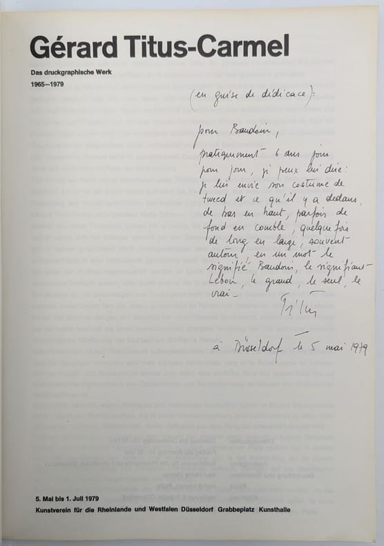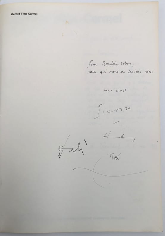 Düsseldorf, Kunstverein für die Rheinlande und Westfalen, 1979, in-4, [102] pp, broché, Première édition de ce catalogue d'exposition de l'oeuvre graphique de Titus-Carmel, avec 113 oeuvres reproduites dont certaines en couleurs. Exemplaire enrichi des signatures autographes de Pablo Picasso, Dali, Miro, Max Ernst pour "Baudoin Lebon, sans qui nous ne serions rien" et d'une longue note manuscrite "en guise de dédicace" de Titus-Carmel adressée à Baudoin Lebon :"Pour Baudoin, Pratiquement 6 ans, jour pour jour, je peux lui dire : je lui envie son costume de tweed et ce qu'il y a dedans, de bas en haut, parfois de fond en comble, quelque fois de long en large, souvent autour, en un mot signifié Baudoin, le signifiant Lebon, le grand, le seul, le vrai. à Düsseldorf le 5 mai 1979". Très bon exemplaire. Couverture rigide