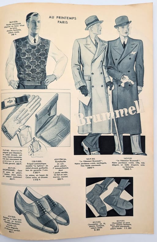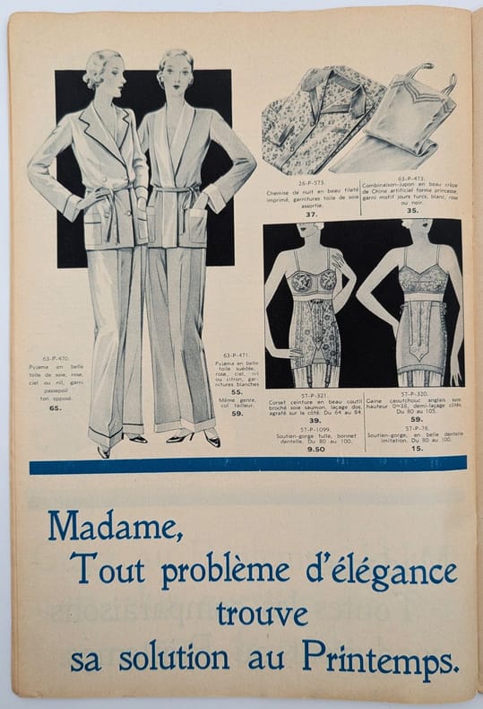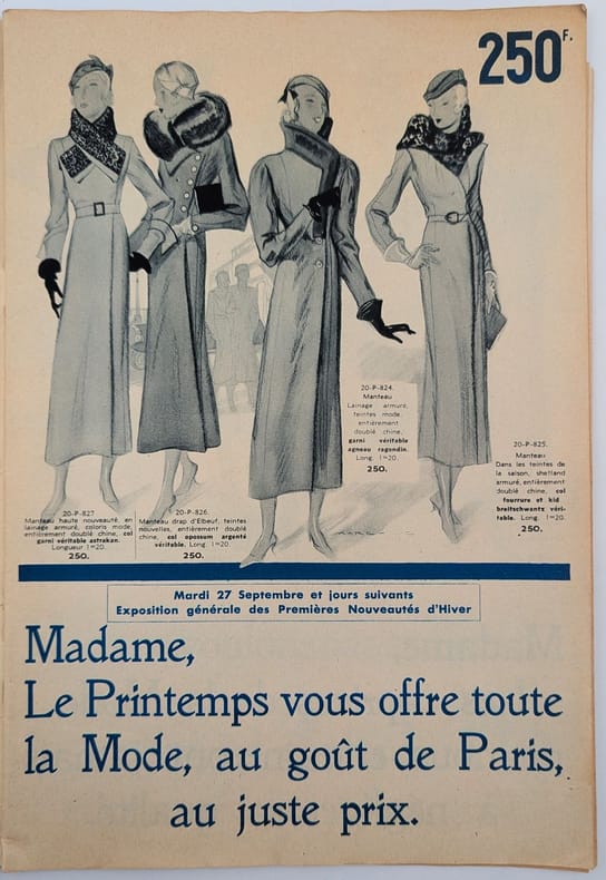 Paris, Au Printemps, 1932-1933, in-4, [29] pp, Broché, couverture illustrée, Catalogue illustré en noir de mode vestimentaire féminine et masculine. Légers plis et accrocs aux plats de couverture. Couverture rigide