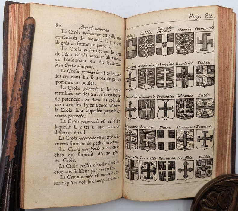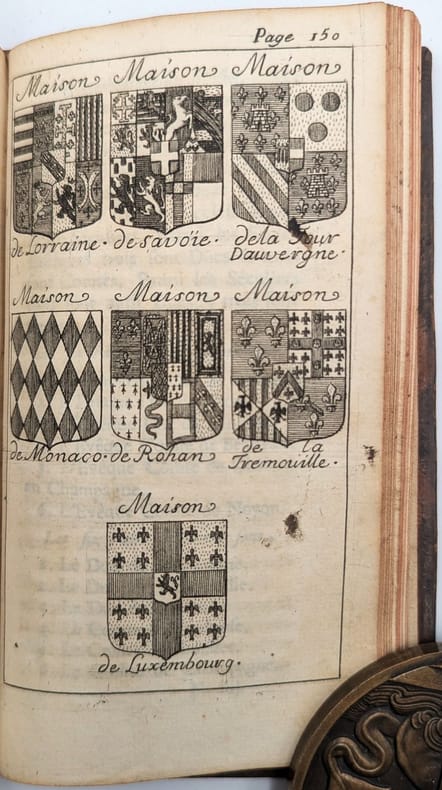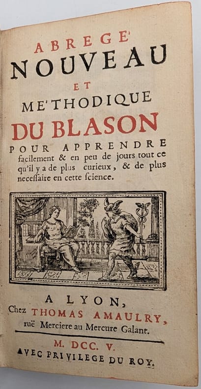 Lyon, Thomas Amaulry, 1705, in-8, [24]-168-[24] pp, 14 pl, Basane havane de l'époque, dos à nerfs et fleuronné, pièce de titre rouge, tranches rouges, Une vignette au titre et nombreuses petites figures d'écus gravées sur bois dans le texte, démontrant les pièces, meubles et émaux héraldiques; quatorze planches et une figure sur cuivre dans le texte. Quelques annotations marginales anciennes. Cachet humide à la fin ("Villette Chartres"). Frottement sur le dos et les plats, coins usés. Bon état intérieur. Couverture rigide