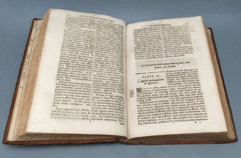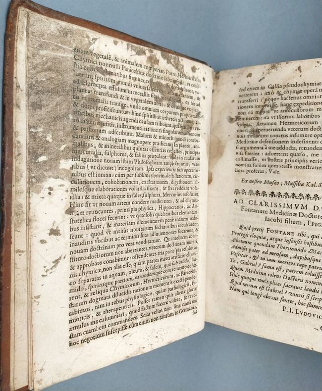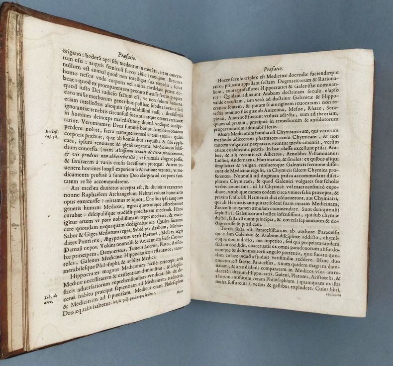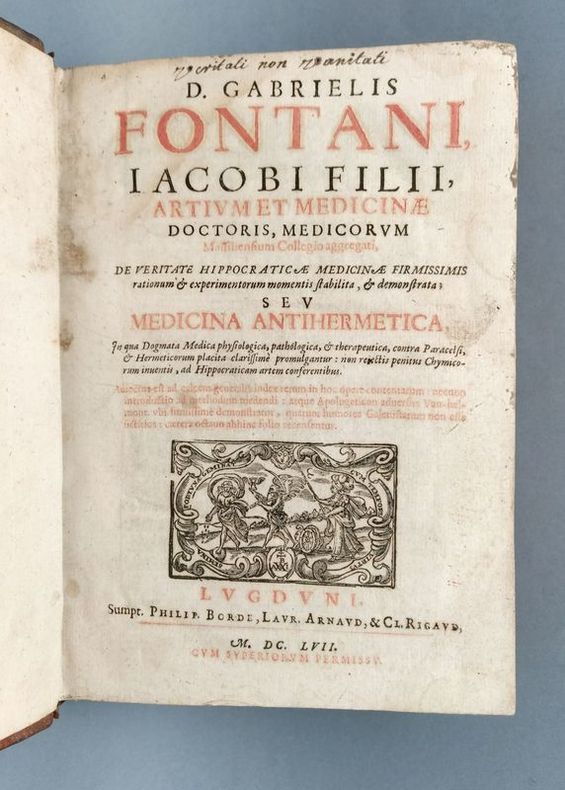 Lugduni, sumpt. Philip Borde, Laur. Arnaud, & Cl. Rigaud, 1657, in-4, [28]-464-[30] pp, Basane havane de l'époque, dos à nerfs et fleuronné, Édition originale de cette "Vérité de la médecine hippocratique", ou "Médecine antihermétique" par Gabriel Fontaine, médecin agrégé du Collège Marseille. L'auteur y énonce les dogmes médicaux physiologiques, pathologiques et thérapeutiques contre les préceptes de Paracelse et des hermétiques : il considère la pensée de ces derniers comme une hérésie médicale, à l'instar de son contemporain Guy Patin et à la suite des écrits de son père Jacques Patin, professeur de médecine à la Faculté d'Aix-en-Provence, et surtout de ceux de Thomas Erastus, dont il admet vouloir actualiser la théorie. À l'inverse, il se fait le défenseur des véritables vues médicales des anciens, en particulier des disciples d'Hippocrate et de Galien. Toutefois, il ne rejette pas entièrement les découvertes des chimistes pour la préparation de certains médicaments, tout en réfutant l'utilisation des alcools antimoniaux, du soufre et de l'arsenic. In fine, son livre contient une apologie contre le iatrochimiste Van Helmont (Apologesticon advertus Van Helmont), dans laquelle il cherche à démontrer que les quatre humeurs des galénistes ne sont pas fictives. Ex-libris manuscrit ancien en tête du titre. Ex-libris de Jean Rouché. Épidermures, auréole intérieure, large taches brunes sur les premiers feuillets. Krivatsy, n° 4165. Couverture rigide