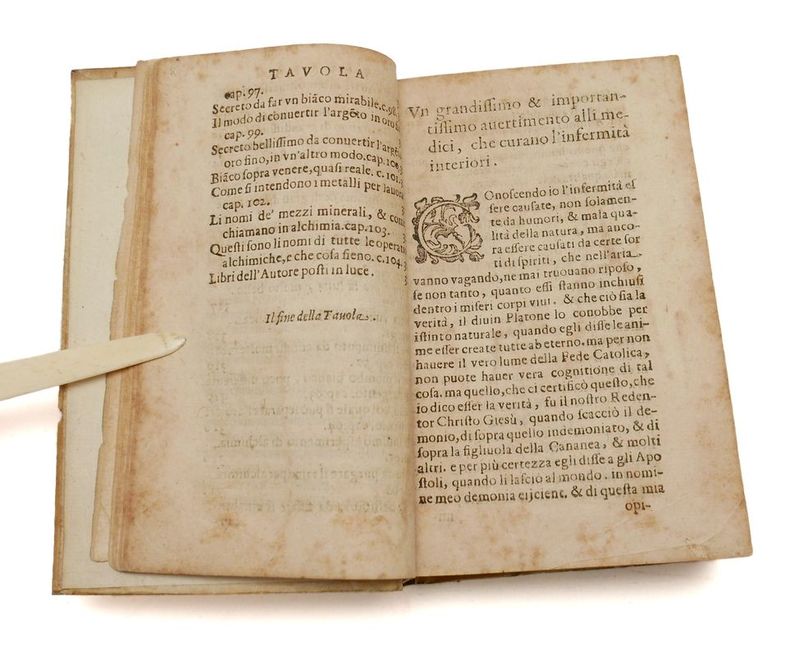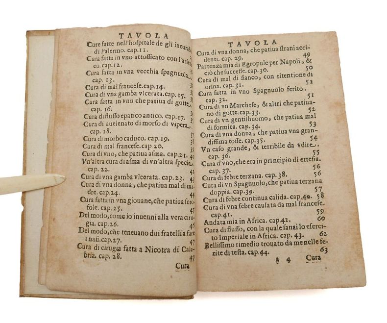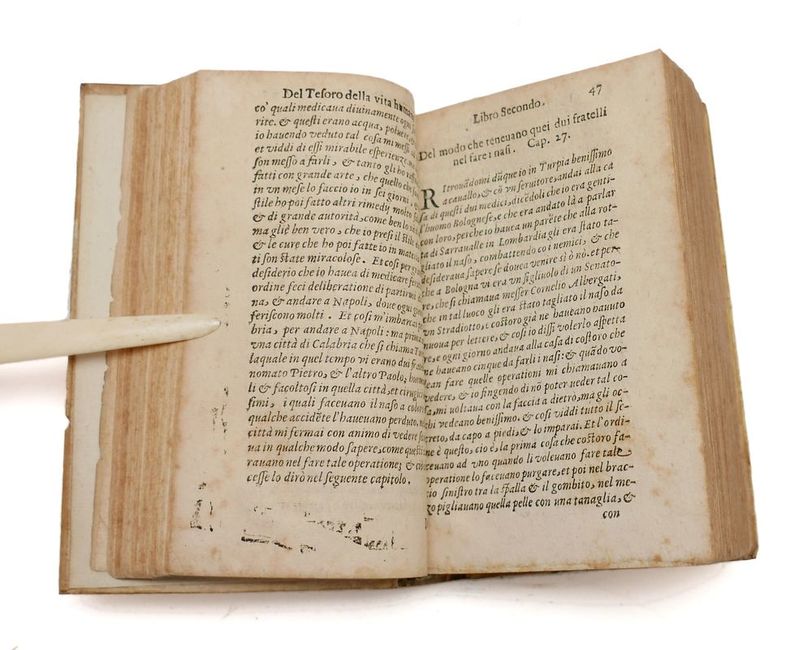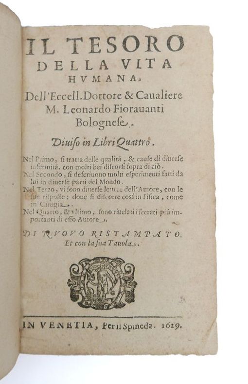 In Venetia, per il Spineda, 1629, in-8, [16]-327 ff, Vélin de l'époque, titre manuscrit en long en lettres gothiques, Très rare ouvrage du chirurgien bolonais Leonardo Fioravanti (1517-1588), paru pour la première fois en 1570. L'auteur y a réuni de très nombreuses observations de maladies et infirmités, la plupart sous forme de lettres à des confrères ou des patients ; mais l'ouvrage est surtout reconnu pour être l'un des premiers à traiter de chirurgie plastique et, plus précisément, de rhinoplastie, avec la description de la "greffe italienne". C'est sans doute sa lecture qui inspira à Gaspare Tagliacozzi ses propres travaux et la rédaction du célèbre De Chirurgia Curtorum per Insitionem (1597). Fioranvanti compte parmi les figures les plus insolites de la médecine de son époque. Il quitta sa ville natale à l'âge de 31 ans pour mener une vie de voyageur : à Naples, il fut enrôlé en tant que chirurgien à bord de la flotte espagnole qui faisait route vers la côte nord de l'Afrique. Au cours de cette expédition, qu'il relate dans le Tesoro della vita humana, il assiste à une altercation entre deux soldats, dont un certain Andres Gutierrez qui se retrouve avec un bout de nez tranché ; Fioravanti rapporte avoir ramassé la partie sectionnée dans le sable, avoir uriné dessus pour la nettoyer et l'avoir recousue. Le succès de l'opération pouvait être attesté, selon l'auteur, par le témoignage du blessé, qui était encore en vie lors de la rédaction de l'ouvrage. Lors de son retour d'Afrique, Fioravanti se rendit en Calabre pour aller à la rencontre de deux chirurgiens qui pratiquaient la fameuse "méthode secrète" italienne de reconstruction du nez, les frères Pietro et Paolo Vineo (ou Vianeos), qui l'avaient eux-mêmes mise en pratique d'après la description faite au siècle précédent par Antonio Branca : sur invitation des chirurgiens, l'auteur assista ainsi à cinq opérations qu'il suivit tout du long, depuis l'entaille faite dans le bras, la suture faite entre le lambeau de chair et le nez, l'immobilisation jusqu'à ce que la peau "pousse dans le nez" (vascularisation de la greffe) et la pose d'une pièce en métal pour conformer le nez dans de bonnes proportions (chapitre 27, pp. 47-48). Fioravanti se rendit ensuite à Rome et à Venise, où il fit publier de nombreux ouvrages, qui connaitront tous plusieurs éditions au cours des XVIe et XVIIe siècles et seront traduits dans plusieurs langues. En 1568, il revint à Bologne, où il fut reçu docteur au sein du célèbre Collegio de' Dottori. Ex-libris de Jean Rouché. Krivatsy 4098. Wellcome I, n° 2306. Mazzola & Santoni-Rugiu, "Leonardo Fioravanti (1517-1588): A Barber-Surgeon Who Influenced the Development of Reconstructive Surgery. In Plastic and Reconstructive Surgery", February 1997, volume 99, Issue 2, pp. 570-575. Couverture rigide