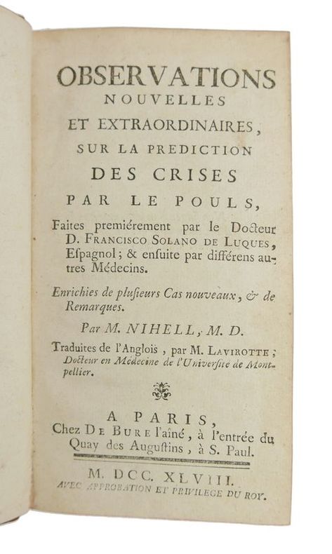 Edition originale de la traduction française. Dans cet ouvage, Nihell rend hommage à Don Solano, médecin espagnol à Antéquera en Andalousie et va même le voir pendant deux mois (il était alors en poste à Cadix, donc à peu de distance), ce qui lui permet de vérifier la méthode et les témoignages avancés dans son ouvrage paru sous le titre Lapis Lydius Apollonis ; Nihell est ainsi convaincu que l'examen du pouls permet de diagnostiquer des crises futures ; il corrige les conclusions un peu hâtives de Don Solano, ce qui n'enlève rien à la qualité des observations réalisées. L'examen du pouls devient, grâce à ces deux médecins, un moyen précis de diagnostic. Petites restaurations, bon exemplaire. (Welcomme IV-239 ; Dezeimeis IV-186 et s.)