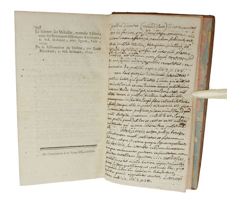 À Paris, chez de Bure, 1748, in-12, XLIV-[2] pp. [1] ff. bl, 258 pp, Basane marbrée de l'époque, dos à nerfs et fileté, tranches rouges, Première édition française de cet ouvrage "enrichi de plusieurs cas nouveaux, & de Remarques" par l'Anglais James Nihell. La première édition anglaise est de 1741. Il est intréressant de noter que cet ouvrage fut aussi traduit et réimprimé plusieurs fois en latin. L'Espagnol Francisco Solano de Luques (1685-1738) observa pour la première fois le "pouls dicrote" en 1707 et remarqua que ce pouls dépendait presque toujours du saignement de nez. De cette observation, il essaya de déduire comment on pourrait prévoir "les autres évacuants" par la pulsation du sang. Ces observations parurent à Madrid en 1737 (cf. Dézeimeris, IV, 187) ; l'Anglais Nihell les traduisit faisant ainsi connaître la doctrine de Solano tombée dans l'oubli. Longue annotation manuscrite ancienne sur les gardes blanches finales. Ex-libris de Jean Rouché. Blake, p. 325. Wellcome IV, p. 239. Couverture rigide