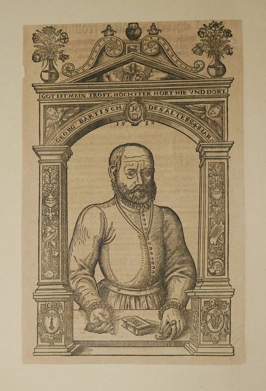 [Dresde, Matthes Stöckel], [1583], , 1 f, , Gravure sur bois ornant le fameux traité de Bartich, l'Ophtalmodouleia. Elle est montée sur une planche de papier et elle a conservé son texte au dos. Bartich est considéré comme le père de l'ophtalmologie moderne. Dimensions du feuillet : 28 x 18 cm. Petite déchirure du coin inférieur droit, petite atteinte à l'image. Couverture rigide