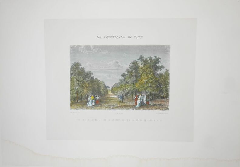 Paris, J. Rothschild, [1867-1873], , 1 f, , Gravure sur bois rehaussée en couleurs d'après un dessin de Gauchard, gravé par Weber, tirée de Les Promenades de Paris (d'Adolphe Alphand) et montée sur une planche. Dimensions de la gravure : 26 x 32.2 cm; de la planche : 37.5 x 55.5 cm. Mouillure marginale de la planche sans atteinte à l'image Couverture rigide
