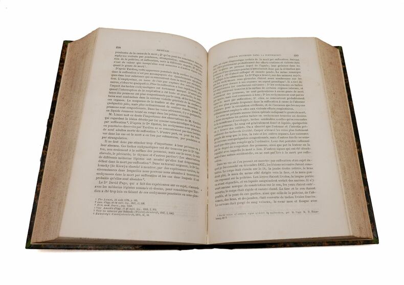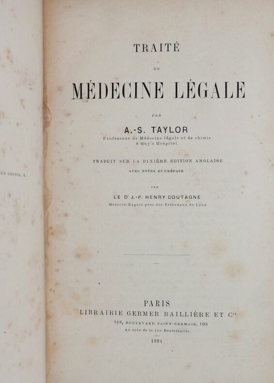 Paris, Germer Baillière et Cie, 1881, in-4, [4]-VIII-936 pp, Demi-toile chagrinée noire de l'époque, Première édition française. Traduction du Manual of Medical Jurisprudence, paru à l'origine en 1844. Alfred Swaine Taylor (1806-1880) fut une autorité en la matière : ses ouvrages ont connu de très nombreuses éditions et traductions. Ses Elements of Medical Jurisprudence (Londres, 1836) constituent, pour la langue anglaise, l'un des ouvrages de référence. Étiquette ex-libris : diable moqueur aux initiales "N.H." Rousseurs éparses, principalement en tête de volume. Légère usure des charnières, accroc à la coiffe supérieure. Hirsch, V, p. 525. Couverture rigide