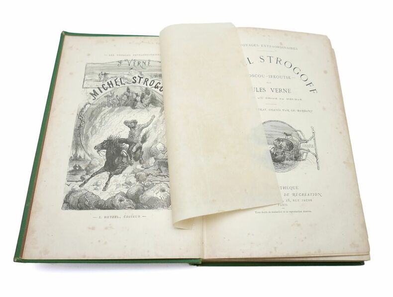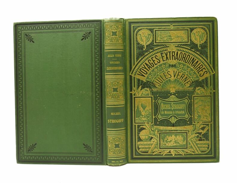 Hachette Editeur ( non signalé en page de titre ) - Série " Les Voyages Extraordinaires - Collection Hetzel " sans date. In-8 pleine toile rouge de 368 pages au format 18,5 x 5 x 28 cm. Magnifique premier plat polychrome, à un éléphant et à l'éventail. Titre dans le cartouche. Dos au phare. Tête et tranches dorées. Quatrième plat de type " R " avec le monogramme de l'éditeur dans un macaron losangique. Cartonnage paru avant 1914 avec sans mention de Hachette Editeur en page de titre et imprimerie Belin Frères en dernière page. Il s'agit d'un des tout derniers volume double, publiés sous le nom " Hetzel " malgré le rachat par Hachette. Livre qui contient " Michel Strogoff, de Moscou à Irkoutsk " suivi de " Un drame au Mexique " avec des illustrations par J. Férat, gravées par Charles Barbant dont 8 hors texte en couleurs et 2 cartes. Premier plat superbe avec " ors " très frais. Minuscules frottis aux coins. Intérieurs avec des rousseurs et brunissures à quelques pages. Exemplaire avec reliure bien solidaire en superbe état général. Peu courant.