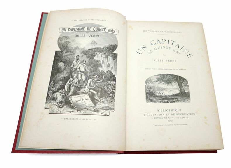 1878 Paris, Bibliothèque d'éducation et de récréation, J. Hetzel, 1878, les volumes 27 et 28 de la collection, reliés ensemble en un volume grand in-8 de (4)-380 pp.-(4)-380 pp., reliure de l'époque de demi-veau bleu foncé, dos lisse portant le titre "Un capitaine de quinze ans" et l'année "1878", bon exemplaire.