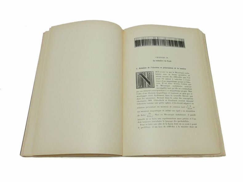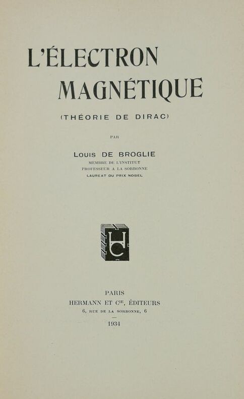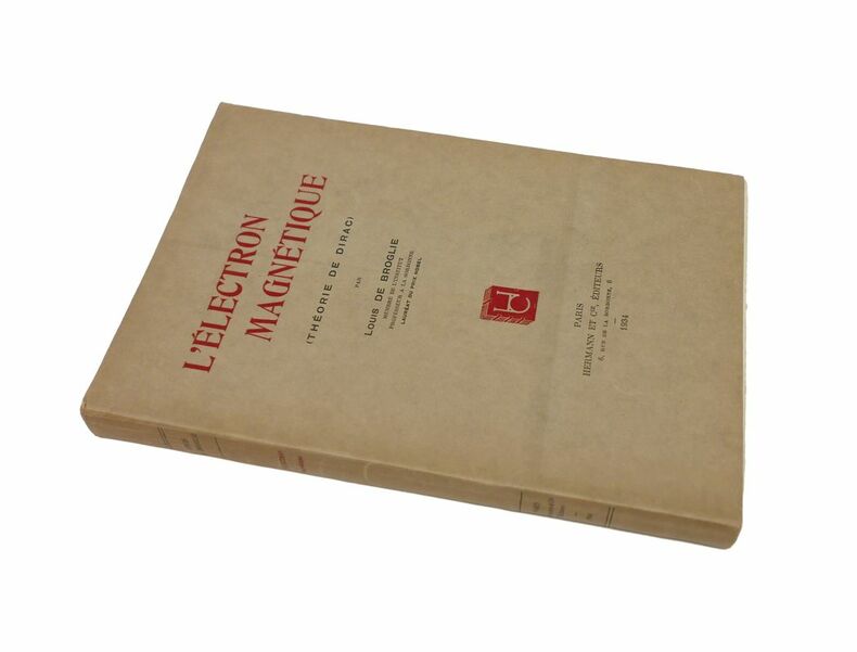 Paris, Hermann et Cie, éditeurs, 1934, in-8, VIII-315 pp, Broché, couverture imprimée, Édition originale cet ensemble de cours professés par le physicien français Louis de Broglie (1892-1987) - récipiendaire du Prix Nobel de 1929 pour ses travaux sur la mécanique ondulatoire, expose sa théorie de la lumière dite "neutrinienne" - fondée sur l'idée que le photon résulte de la fusion de deux particules neutres, les hypothétiques neutrinos de Dirac. Petits manques et déchirures à la couverture. Couverture rigide