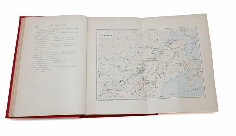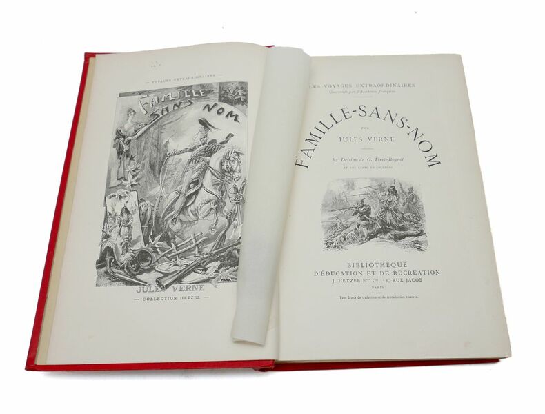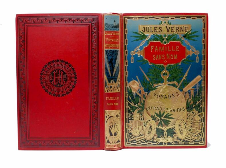 Première édition illustrée de 82 dessins de Tiret-Bognet, et une carte en couleurs du cours du Saint-Laurent. Catalogue EX in fine pour 1890. Cartonnage aux 2 éléphants de type Lenègre 3. Second plat de type Lenègre e. Ce cartonnage n'a connu que la couleur rouge. Quelques rousseurs éparses sur un papier bien blanc. Cette édition porte une étiquette ajoutée sur le cartouge corrigé, Une famille sans nom, devenant Famille sans nom avec la nouvelle étiquette. Belle plaque supérieure, aux ors bien nets. Coins bien pointus et rigides. Tranches dorées régulières. Dos uniformément insolé mais aux ors bien présents. Coiffes légèrement repliées. Beau second plat, sans défaut. Percaline brillante. Bel exemplaire, bien ferme et solidaire. Histoire d'une famille française du Canada pendant la rébellion des Patriotes (1837-1838) contre l'injustice britannique. Un des titres les plus graves de l'auteur, sans fin heureuse. - Photographies et détails sur www.Edition-Originale.com -
