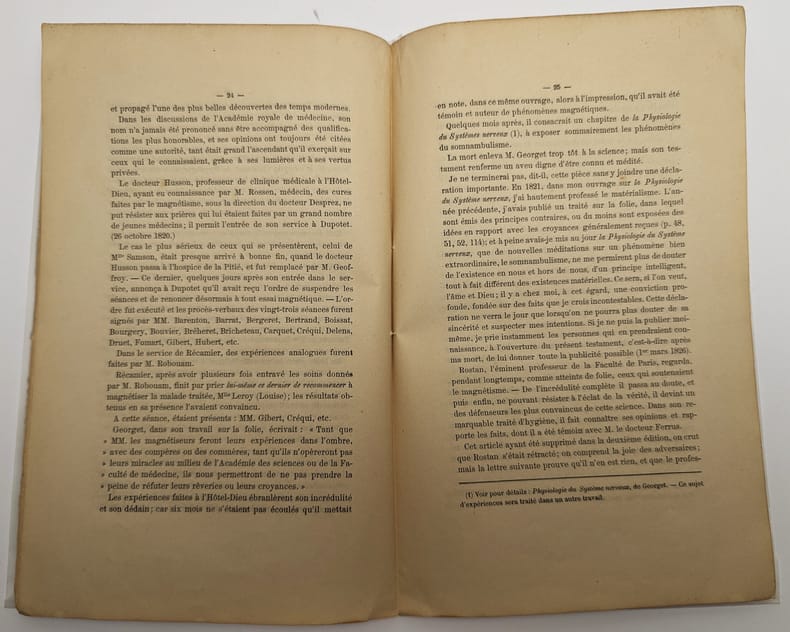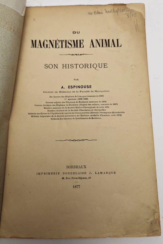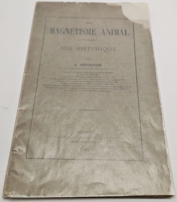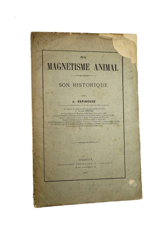 Bordeaux, J. Lamarque, 1877, in-8, 47 pp, Broché, couverture originale imprimée, ÉDITION ORIGINALE de cet essai sur l'historique du magnétisme animal du docteur en médecine A. Espinouse. Exemplaire majoritairement non coupé. Ex-libris manuscrit Michel Collée. Couverture usagée avec manques. Couverture rigide