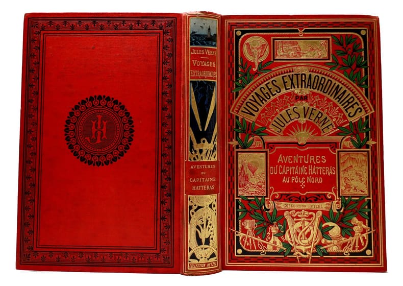 Voyages Extraordinaires. Les Mondes connus et inconnus. Les Anglais au pôle nord - Le Désert de glace. 150 vignettes par Riou. C'est le 1er titre de Jules Verne.Premier cartonnage. Paris, Bibliothèque d'Éducation et de Récréation J. Hetzel - 1868 - 467 pages.Relié par Lenègre. Imprimé chez Jules Bonaventure.RARE Cartonnage Hetzel monochrome bleu personnalisé. Ours sur la banquise dans le macaron. Rare dans cette couleur. On le voit d'habitude en rouge ou en brique. Tranches dorées. Gouttière régulière. Gardes grises. Bords de la p341 restaurés. Quelques rousseurs de p273 à p288. Très rares rousseurs sur les autres pages. Très bon état. Format in-4°(27x18).Ces cartonnages (appelés aussi plats spéciaux) concernent 5 titres : 1° Voyages et Aventures du capitaine Hatteras. 2° Cinq semaines en ballon / Voyage au centre de la terre. 3° Les enfants du capitaine Grant. 4° Vingt mille lieues sous les mers. 5° L'île mystérieuse.