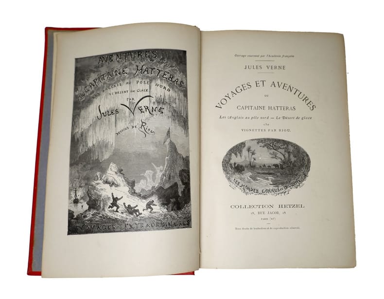 Paris, J. Hetzel. Bibliothèque d'Education et de Récréation, 1867, (sd)., in-8 (185x280), demi-basane rouge, dos à nerfs, plats papier marbré, 466p., 220p. Première édition grand in-8 illustrée pour le Capitaine Hatteras, 1866 (bien que la page de titre soit datée 1867). Plats frottés. Rousseurs inégales.