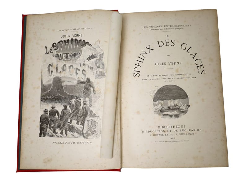 Edition illustrée de 68 illustrations par George Roux dont 20 grandes gravures en chromotypographie et une carte. Catalogue Y in-fine. Cartonnage d'éditeur Hetzel signé Engel dit "au globe" de type 4, dos au phare, deuxième plat de type Engel "i" selon Jauzac, toutes tranches dorées. Coiffes légèrement affaissées, quelques rousseurs. Le Sphinx des glacesest unroman fantastique, qui se veut une suite au roman d'Edgar Poe- auquel il est dédié -,Les Aventures d'Arthur Gordon Pym, publié en1838. Exemplaire non signalé par Jauzac. - Photographies et détails sur www.Edition-Originale.com -
