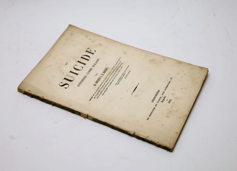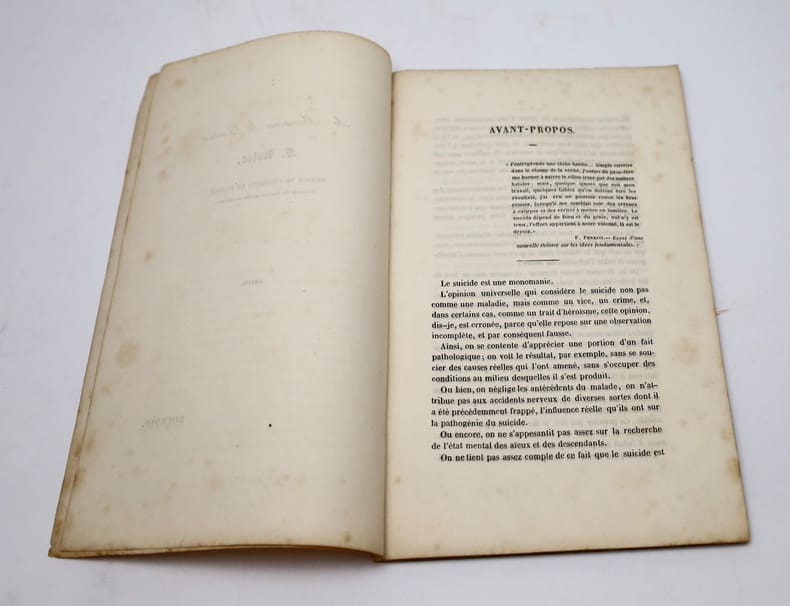 Batignolles, imprimerie de Hennuyer et Turpin, 1845, in-8, 95 pp, Broché, sans couverture, Édition originale. Claude-Étienne Bourdin (1815-1886), médecin et statisticien originaire de Franche-Comté, exerça deux ans comme médecin interne de la maison d'aliénés de Saint-Marcel. Il est l'auteur de travaux importants sur la catalepsie, l'alcoolisme et surtout sur le suicide considéré comme une maladie. Quelques rousseurs. En l'état, sans couverture. Couverture rigide