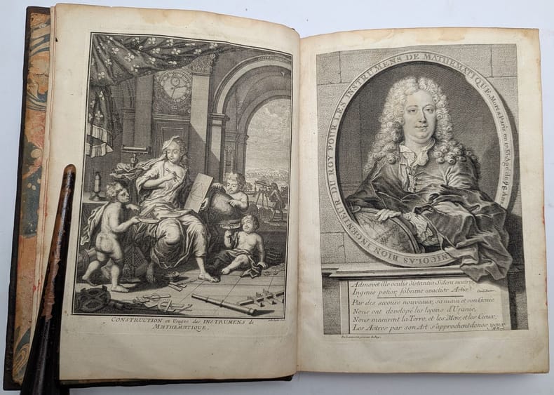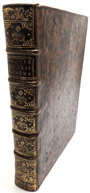 A la Haye, chez P. Husson, etc, 1723, in-4, Frontispice, (8)-389-(3) pp, 30 pl. gravées dépliantes, veau marbré de l'époque, dos à caissons ornés de fleurons, tranches rouges, Nouvelle édition, après l'originale parue en 1709, illustrée d'un beau frontispice allégorique par Coster, d'une vignette de titre par Picart, et de 30 planches, la plupart dépliantes (avec souvent de multiples figures), numérotées de 1 à 28, et deux autres notées A et B, représentant les instruments construits par Nicolas Bion. Bon exemplaire aux planches bien encrées dans sa reliure d'époque dont la coiffe supérieure et le dos sont frottés. Couverture rigide