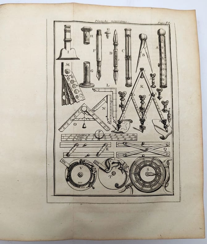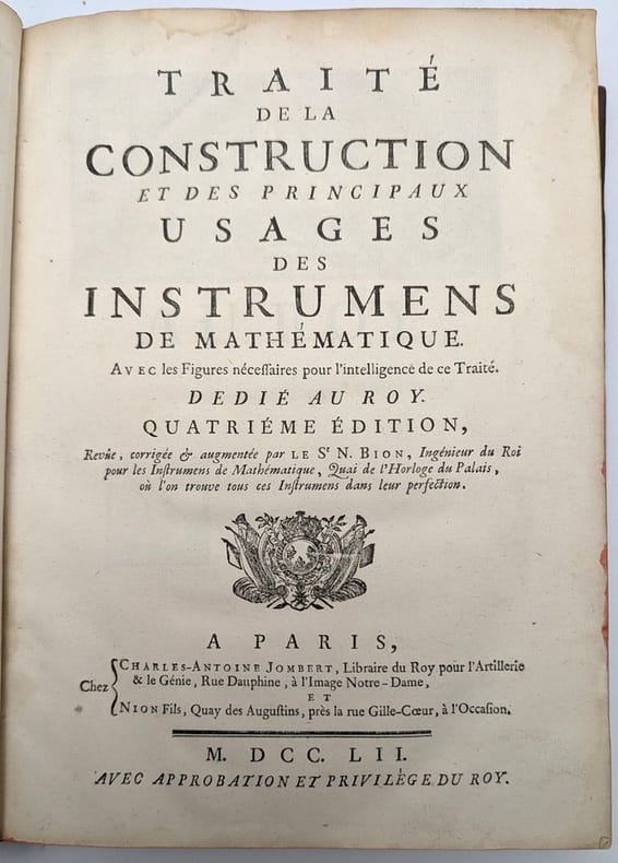 1752 Paris: Charles-Antoine Jombert, Nion Fils, 1752. Quatrième édition, revue, corrigée & augmentée, in-4; Table, Approbation, Privilège, portrait de bion , bel en-tête gravé de Scotin, 37 planches dépliantes montées sur onglets, lettrines, bandeaux et culs-de-lampe. Reliure d’époque en demi-veau noir Superbe exemplaire de ce recueil qui fait une description des instruments scientifiques de l'epoque :instruments de navigation divers, boussoles, compas, horloges de mer, niveaux, cadrans solaires et lunaires, mais aussi anémomètres, pompes aspirantes et refoulantes, instruments d’optique, lunettes et télescopes, microscopes et miroirs. Marchand de globes et de sphères; a voir photos sur demande