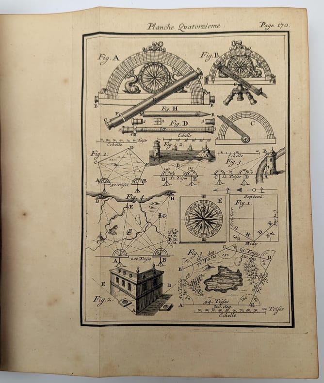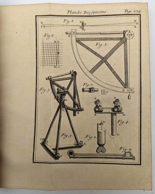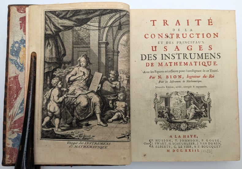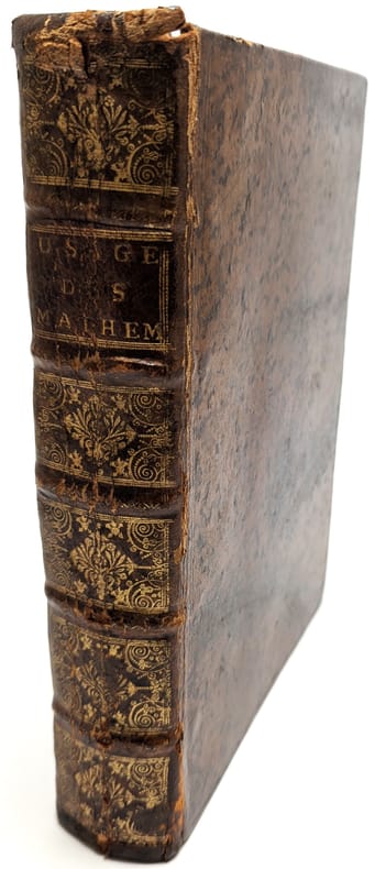A la Haye, chez P. Husson, etc, 1723, in-4, Frontispice, (8)-389-(3) pp, 30 pl. gravées dépliantes, veau marbré de l'époque, dos à caissons ornés de fleurons, tranches rouges, Nouvelle édition, après l'originale parue en 1709, illustrée d'un beau frontispice allégorique par Coster, d'une vignette de titre par Picart, et de 30 planches, la plupart dépliantes (avec souvent de multiples figures), numérotées de 1 à 28, et deux autres notées A et B, représentant les instruments construits par Nicolas Bion. Bon exemplaire aux planches bien encrées dans sa reliure d'époque dont la coiffe supérieure et le dos sont frottés. Couverture rigide